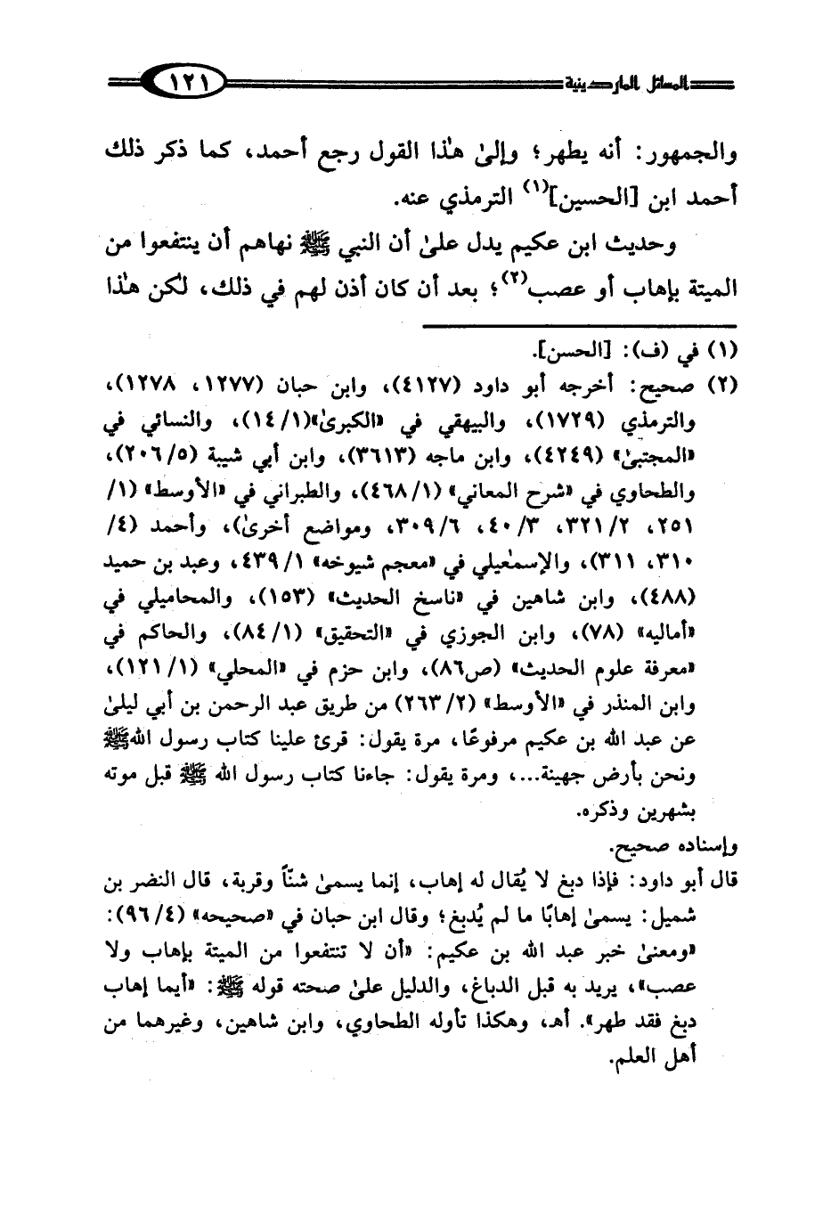 قال أبو داود: فإذا دبغ لا يُقال له إهاب، إنما يسمى شنًّا وقربة، قال النضر بن شميل: يسمى إهابًا ما لم يُدبغ؛ وقال ابن حبان في "صحيحه" (4/ 96): "ومعنى خبر عبد الله بن عكيم: "أن لا تنتفعوا من الميتة بإهاب ولا عصب"، يريد به قبل الدباغ، والدليل على صحته قوله - صلى الله عليه وسلم -: "أيما إهاب دبغ فقد طهر". أهـ، وهكذا تأوله الطحاوي، وابن شاهين، وغيرهما من أهل العلم.