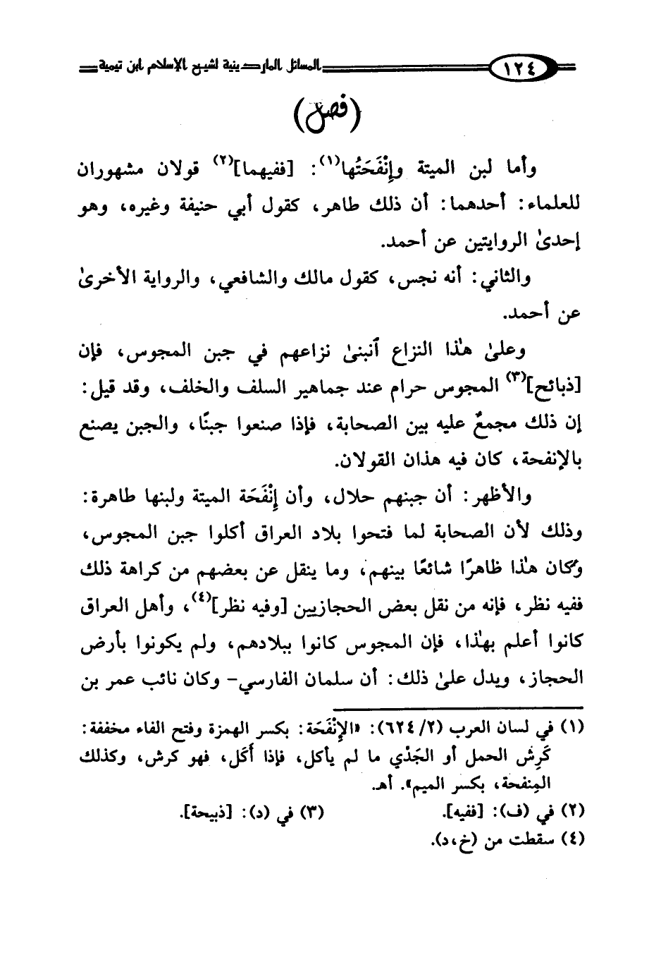 والأظهر: أن جبنهم حلال، وأن إِنْفَحَة الميتة ولبنها طاهرة: وذلك لأن الصحابة لما فتحوا بلاد العراق أكلوا جبن المجوس، وكان هذا ظاهرًا شائعًا بينهم، وما ينقل عن بعضهم من كراهة ذلك ففيه نظر، فإنه من نقل بعض الحجازيين [وفيه نظر] (¬4)، وأهل العراق كانوا أعلم بهذا، فإن المجوس كانوا ببلادهم، ولم يكونوا بأرض الحجاز، ويدل على ذلك: أن سلمان الفارسي -وكان نائب عمر بن
