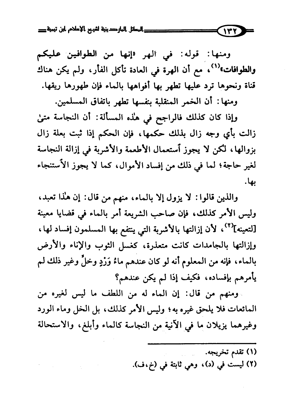 ومنها: قوله: في الهر "إنها من الطوافين عليكم والطوافات" (¬1) مع أن الهرة في العادة تأكل الفأر، ولم يكن هناك قناة ونحوها ترد عليها تطهر بها أفواهها بالماء فإن طهورها ريقها.