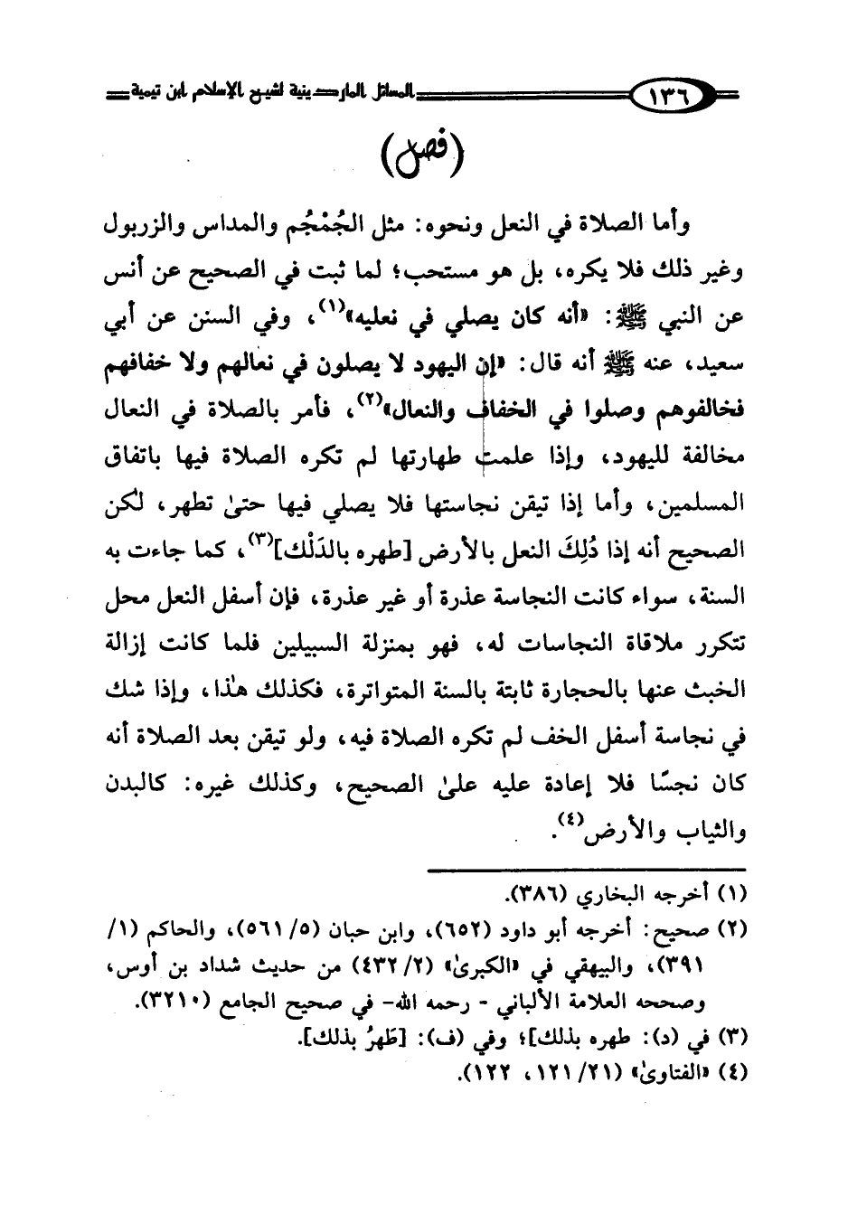 وأما الصلاة في النعل ونحوه: مثل الجُمْجُم والمداس والزربول وغير ذلك فلا يكره، بل هو مستحب؛ لما ثبت في الصحيح عن أنس عن النبي - صلى الله عليه وسلم -: "أنه كان يصلي في نعليه" (¬1)، وفي السنن عن أبي سعيد، عنه - صلى الله عليه وسلم - أنه قال: "إن اليهود لا يصلون في نعالهم ولا خفافهم فخالفوهم وصلوا في الخفاف والنعال" (¬2)، فأمر بالصلاة في النعال مخالفة لليهود، وإذا علمت طهارتها لم تكره الصلاة فيها باتفاق المسلمين، وأما إذا تيقن نجاستها فلا يصلي فيها حتى تطهر، لكن الصحيح أنه إذا دُلِكَ النعل بالأرض [طهره بالدَلْك] (¬3)، كما جاءت به السنة، سواء كانت النجاسة عذرة أو غير عذرة، فإن أسفل النعل محل تتكرر ملاقاة النجاسات له، فهو بمنزلة السبيلين فلما كانت إزالة الخبث عنها بالحجارة ثابتة بالسنة المتواترة، فكذلك هذا، وإذا شك في نجاسة أسفل الخف لم تكره الصلاة فيه، ولو تيقن بعد الصلاة أنه كان نجسًا فلا إعادة عليه على الصحيح، وكذلك غيره: كالبدن والثياب والأرض (¬4).