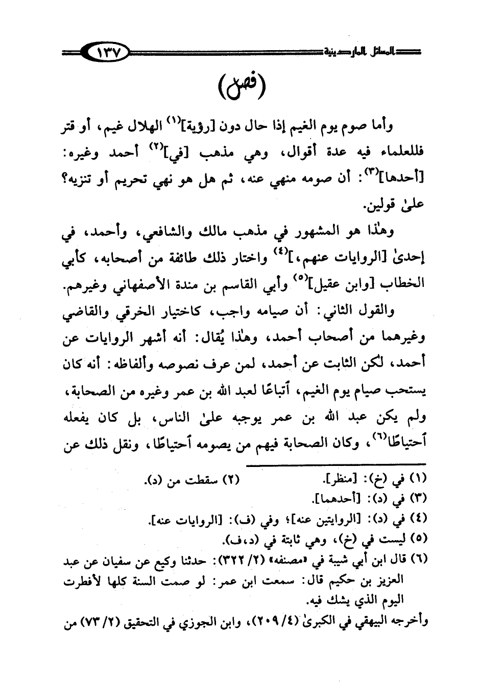 والقول الثاني: أن صيامه واجب، كاختيار الخرقي والقاضي وغيرهما من أصحاب أحمد، وهذا يُقال: أنه أشهر الروايات عن أحمد، لكن الثابت عن أحمد، لمن عرف نصوصه وألفاظه: أنه كان يستحب صيام يوم الغيم، اتباعًا لعبد الله بن عمر وغيره من الصحابة، ولم يكن عبد الله بن عمر يوجبه على الناس، بل كان يفعله احتياطًا (¬6)، وكان الصحابة فيهم من يصومه احتياطًا، ونقل ذلك عن