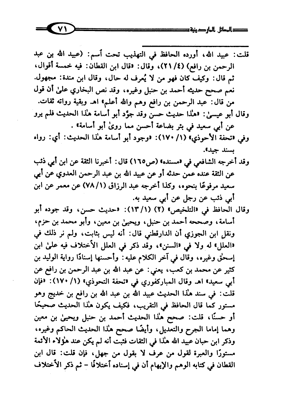 وقال الحافظ في "التلخيص" (2) (1/ 13): "حديث حسن، وقد جوده أبو أسامة، وصححه أحمد بن حنبل، ويحيى بن معين، وأبو محمد بن حزم، ونقل ابن الجوزي أن الدارقطني قال: أنه ليس بثابت، ولم نر ذلك في "العلل" له ولا في "السنن"، وقد ذكر في العلل الاختلاف فيه على ابن اسحق وغيره، وقال في آخر الكلام عليه: وأحسنها اسنادًا رواية الوليد بن كثير عن محمد بن كعب، يعني: عن عبد الله بن عبد الرحمن بن رافع عن أبي سعيد" اهـ. وقال المباركفوري في "تحفة التحوذي" (1/ 170): "فإن قلت: في سند هذا الحديث عبيد الله بن عبد الله بن رافع بن خديج وهو مستور كما قال الحافظ في التقريب، فكيف يكون هذا الحديث صحيحًا أو حسنًا، قلت: صحح هذا الحديث أحمد بن حنبل ويحيى بن معين وهما إماما الجرح والتعديل، وأيضًا صحح هذا الحديث الحاكم وغيره، وذكر ابن حبان عبيد الله هذا في الثقات فثبت أنه لم يكن عند هؤلاء الأئمة مستورًا والعبرة لقول من عرف لا بقول من جهل، فإن قلت: قال ابن القطان في كتابه الوهم والإيهام أن في إسناده اختلافًا -ثم ذكر الاختلاف