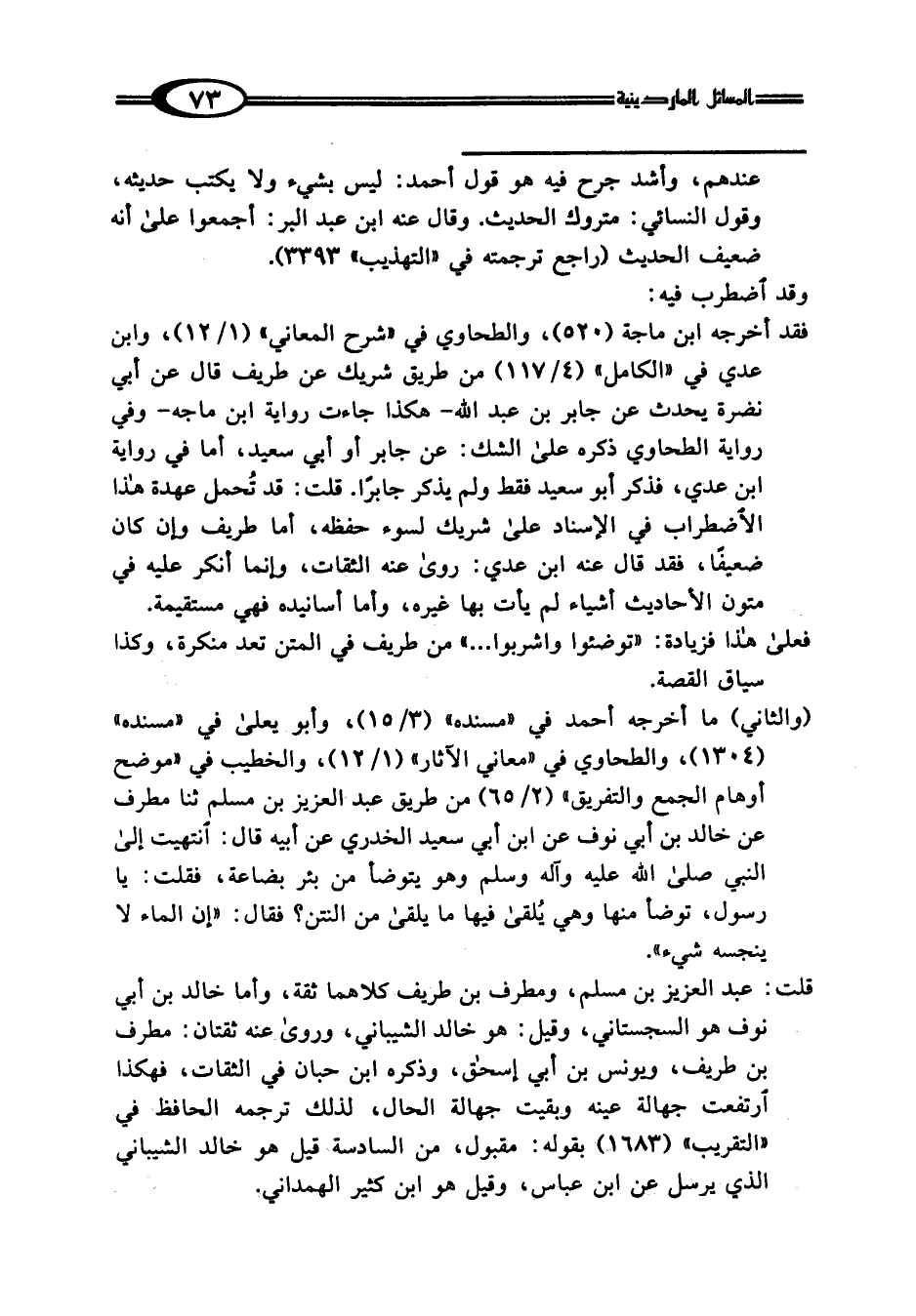 (والثاني) ما أخرجه أحمد في "مسنده" (3/ 15)، وأبو يعلى في "مسنده" (1304)، والطحاوي في "معانى الآثار" (1/ 12)، والخطيب في "موضح أوهام الجمع والتفريق" (2/ 65) من طريق عبد العزيز بن مسلم ثنا مطرف عن خالد بن أبي نوف عن ابن أبي سعيد الخدري عن أبيه قال: انتهيت إلى النبي صلى الله عليه وآله وسلم وهو يتوضأ من بئر بضاعة، فقلت: يا رسول، توضأ منها وهي يُلقى فيها ما يلقى من النتن؟ فقال: "إن الماء لا ينجسه شيء".