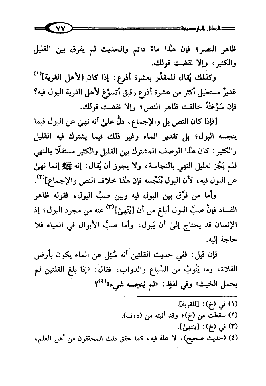 [فإذا كان النص بل والإجماع، دل على أنه نهى عن البول فيما ينجسه البول؛ بل تقدير الماء وغير ذلك فيما يشترك فيه القليل والكثير: كان هذا الوصف المشترك بين القليل والكثير مستقلًا بالنهي فلم يَجُز تعليل النهي بالنجاسة، ولا يجوز أن يُقال: إنه - صلى الله عليه وسلم - إنما نهى عن البول فيه، لأن البول يُنَجسه فإن هذا خلاف النص والإجماع] (¬2).