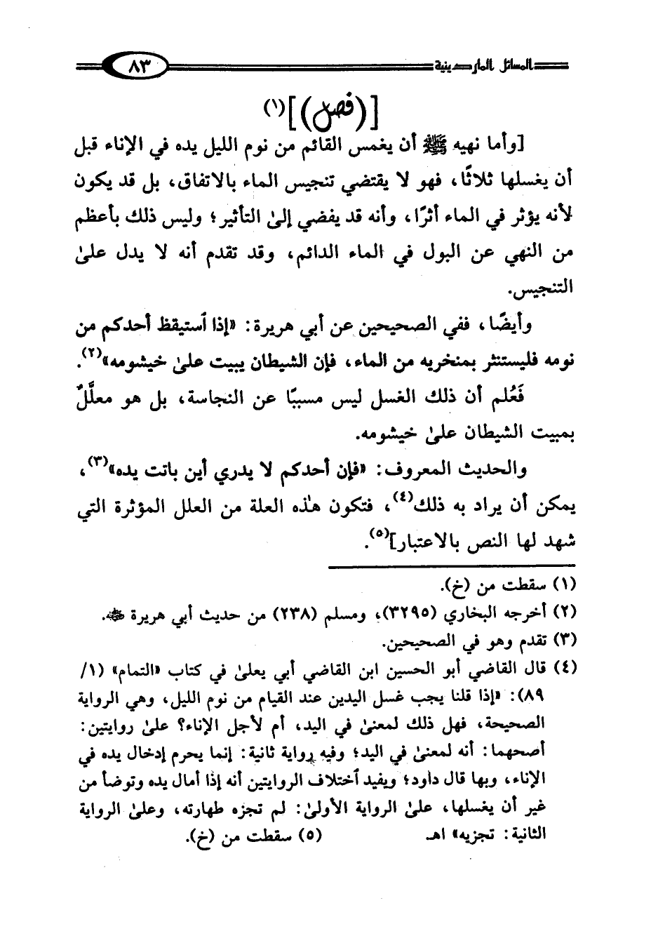 [وأما نهيه - صلى الله عليه وسلم - أن يغمس القائم من نوم الليل يده في الإناء قبل أن يغسلها ثلاثًا، فهو لا يقتضي تنجيس الماء بالاتفاق، بل قد يكون لأنه يؤثر في الماء أثرًا، وأنه قد يفضي إلى التأثير؛ وليس ذلك بأعظم من النهي عن البول في الماء الدائم، وقد تقدم أنه لا يدل على التنجيس.