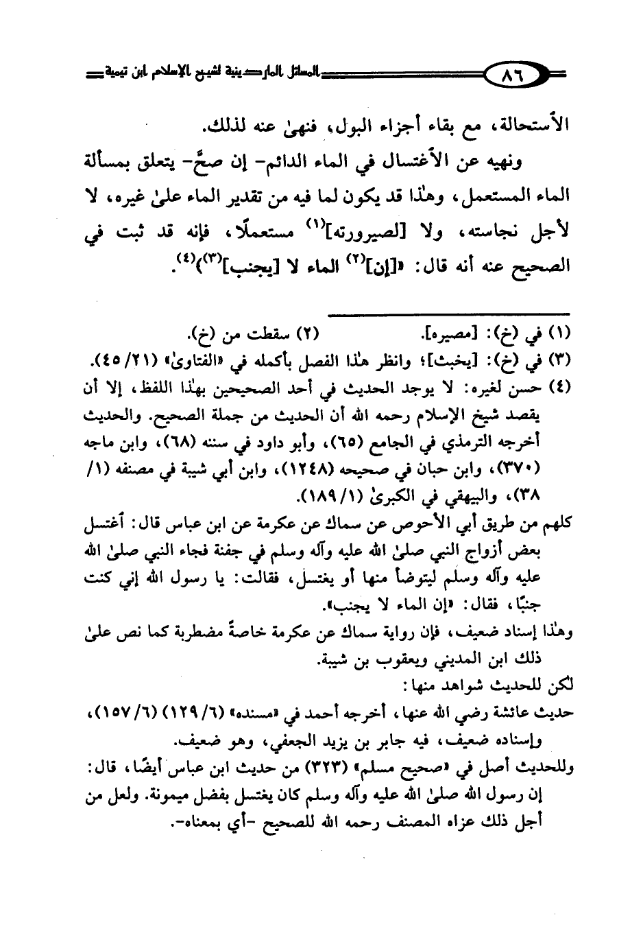 (¬4) حسن لغيره: لا يوجد الحديث في أحد الصحيحين بهذا اللفظ، إلا أن يقصد شيخ الإسلام رحمه الله أن الحديث من جملة الصحيح. والحديث أخرجه الترمذي في الجامع (65)، وأبو داود في سننه (68)، وابن ماجه (370)، وابن حبان في صحيحه (1248)، وابن أبي شيبة في مصنفه (1/ 38)، والببهقي في الكبرى (1/ 189).
