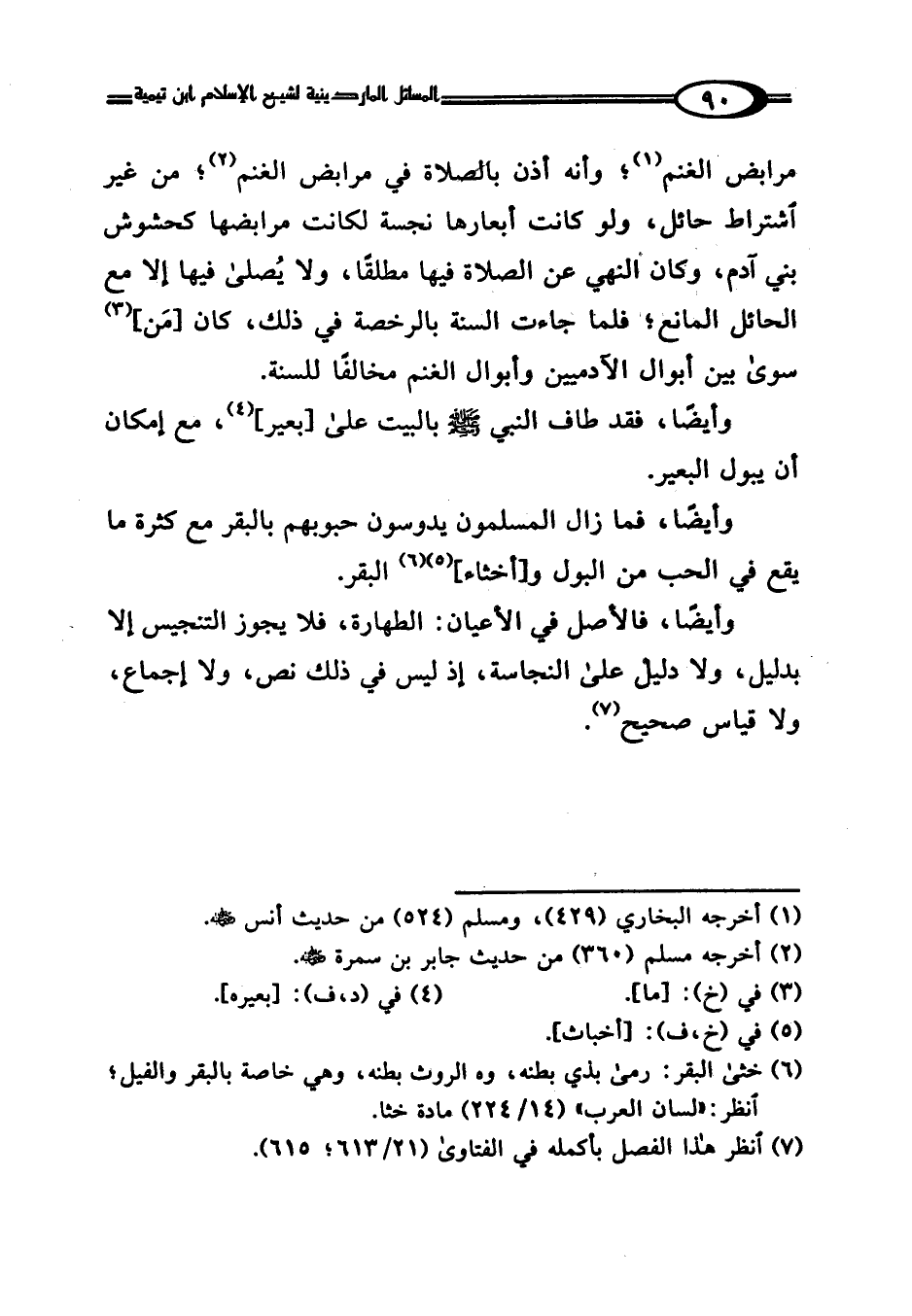 مرابض الغنم (¬1)؛ وأنه أذن بالصلاة في مرابض الغنم (¬2)؛ من غير اشتراط حائل، ولو كانت أبعارها نجسة لكانت مرابضها كحشوش بني آدم، وكان النهي عن الصلاة فيها مطلقًا، ولا يُصلى فيها إلا مع الحائل المانع؛ فلما جاءت السنة بالرخصة في ذلك، كان [مَن] (¬3) سوى بين أبوال الآدميين وأبوال الغنم مخالفًا للسنة.
