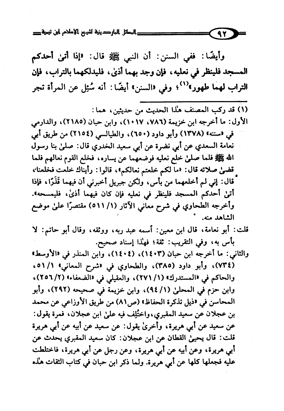 الأول: ما أخرجه ابن خزيمة (786، 1017)، وابن حبان (2185) والدارمي في "سننه" (1378) وأبو داود (650)، والطيالسي (2154) من طريق أبي نعامة السعدي عن أبي نضرة عن أبي سعيد الخدري قال: صلى بنا رسول الله - صلى الله عليه وسلم - فلما صلى خلع نعليه فوضعهما عن يساره، فخلع القوم نعالهم فلما قضى صلاته قال: "ما لكم خلعتم نعالكم"، قالوا: رأيناك خلعت فخلعنا، قال: إني لم أخلعهما من بأس، ولكن جبريل أخبرني أن فيهما قَذَرًا، فإذا أتى أحدكم المسجد فلينظر في نعليه فإن كان فيهما أذى، فليمسحه".