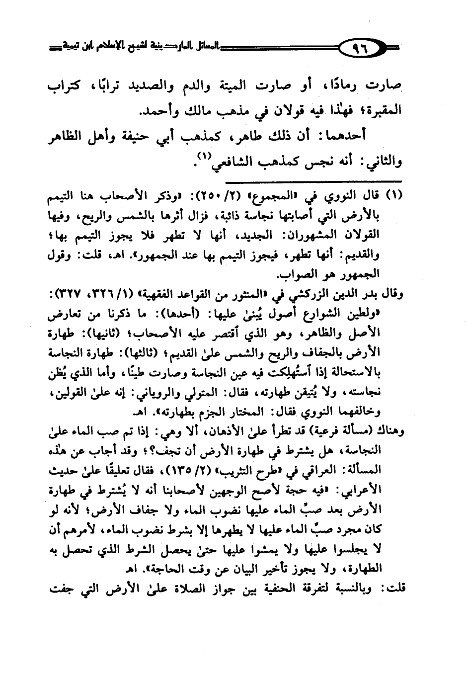 (¬1) قال النووي في "المجموع" (2/ 250): "وذكر الأصحاب هنا التيمم بالأرض التي أصابتها نجاسة ذائبة، فزال أثرها بالشمس والريح، وفيها القولان المشهوران: الجديد، أنها لا تطهر فلا يجوز التيمم بها؛ والقديم: أنها تطهر، فيجوز التيمم بها عند الجمهور". اهـ، قلت: وقول الجمهور هو الصواب.