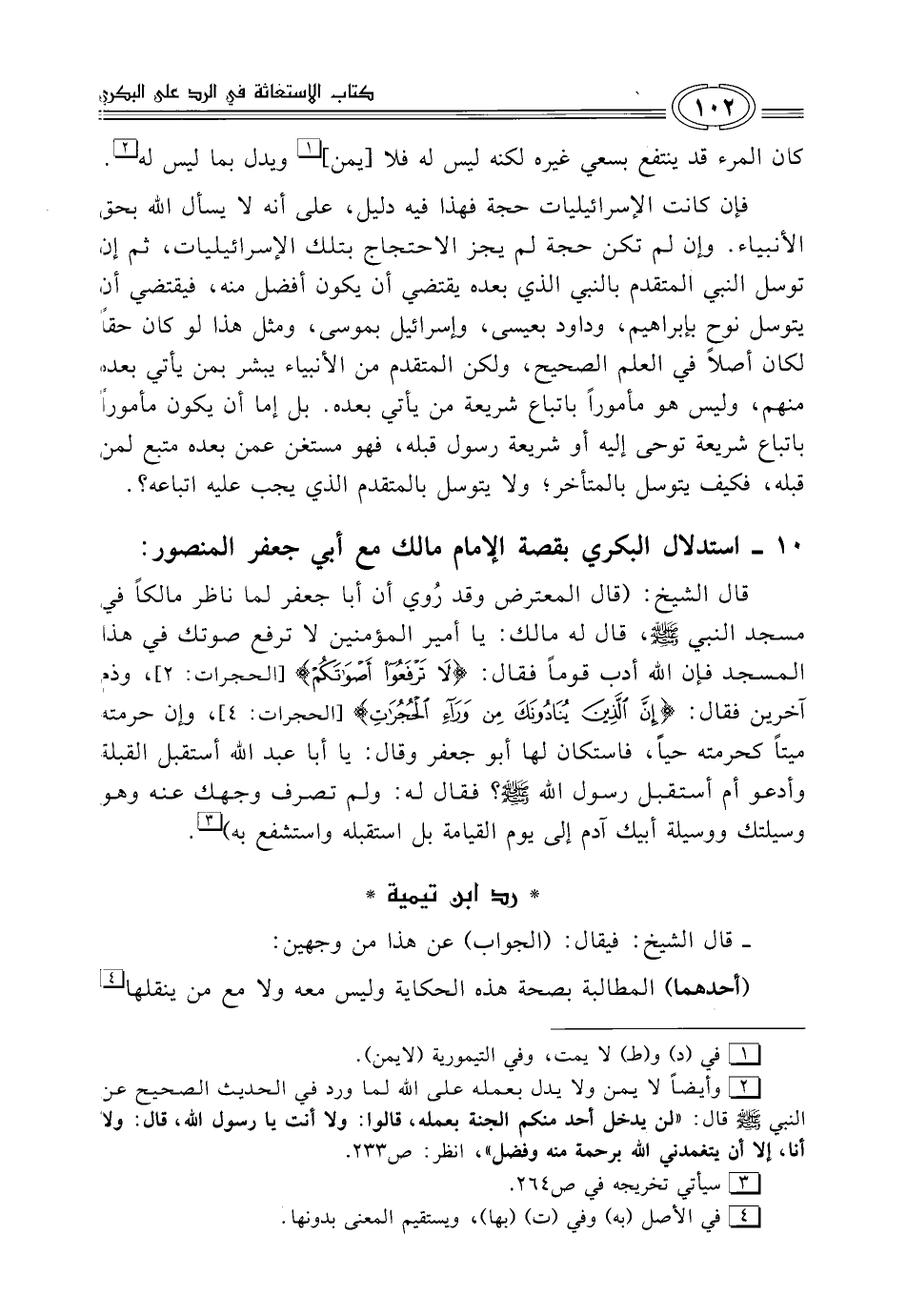 قال الشيخ: (قال المعترض وقد رُوي أن أبا جعفر لما ناظر مالكاً في مسجد النبي - صلى الله عليه وسلم -، قال له مالك: يا أمير المؤمنين لا ترفع صوتك في هذا المسجد فإن الله أدب قوماً فقال: {لَا تَرْفَعُوا أَصْوَاتَكُمْ} [الحجرات: 2]، وذم آخرين فقال: {إِنَّ الَّذِينَ يُنَادُونَكَ مِنْ وَرَاءِ الْحُجُرَاتِ} [الحجرات: 4]، وإن حرمته ميتاً كحرمته حياً، فاستكان لها أبو جعفر وقال: يا أبا عبد الله، أستقبل القبلة وأدعو أم أستقبل رسول الله - صلى الله عليه وسلم -؟ فقال له: ولم تصرف وجهك عنه وهو وسيلتك ووسيلة أبيك آدم إلى يوم القيامة بل استقبله واستشفع به) (¬3).