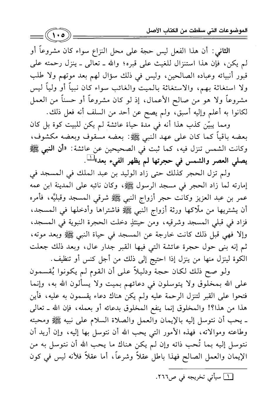 الثاني: أن هذا الفعل ليس حجة على محل النزاع سواء كان مشروعاً أو لم يكن، فإن هذا استنزال للغيث على قبره، والله -تعالى- ينزل رحمته على قبور أنبيائه وعباده الصالحين، وليس في ذلك سؤال لهم بعد موتهم ولا طلب ولا استغاثة بهم، والاستغاثة بالميت والغائب سواء كان نبياً أو ولياً ليس مشروعاً ولا هو من صالح الأعمال، إذ لو كان مشروعاً أو حسناً من العمل لكانوا به أعلم وإليه أسبق، ولم يصح عن أحد من السلف أنه فعل ذلك.