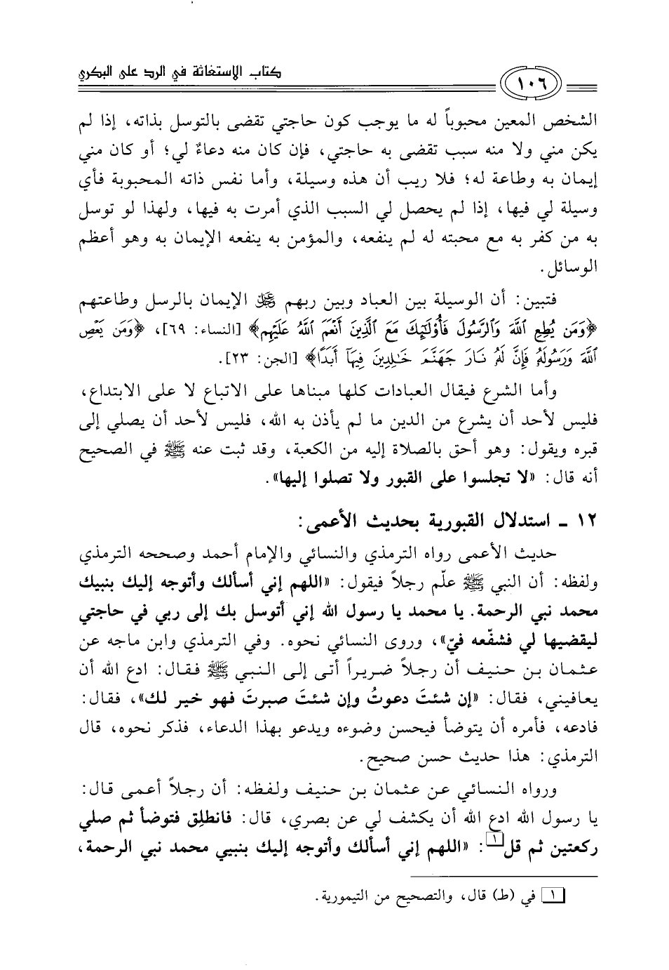 حديث الأعمى رواه الترمذي والنسائي والإمام أحمد وصححه الترمذي ولفظه: أن النبي - صلى الله عليه وسلم - علّم رجلاً فيقول: "اللهم إني أسألك وأتوجه إليك بنبيك محمد نبي الرحمة. يا محمد يا رسول الله إني أتوسل بك إلى ربي في حاجتي ليقضيها لي فشفّعه فيّ"، وروى النسائي نحوه. وفي الترمذي وابن ماجه عن عثمان بن حنيف أن رجلاً ضريراً أتى إلى النبي - صلى الله عليه وسلم - فقال: ادع الله أن يعافيني، فقال: "إن شئتَ دعوتُ وإن شئتَ صبرتَ فهو خير لك"، فقال: فادعه، فأمره أن يتوضأ فيحسن وضوءه ويدعو بهذا الدعاء، فذكر نحوه، قال الترمذي: هذا حديث حسن صحيح.
