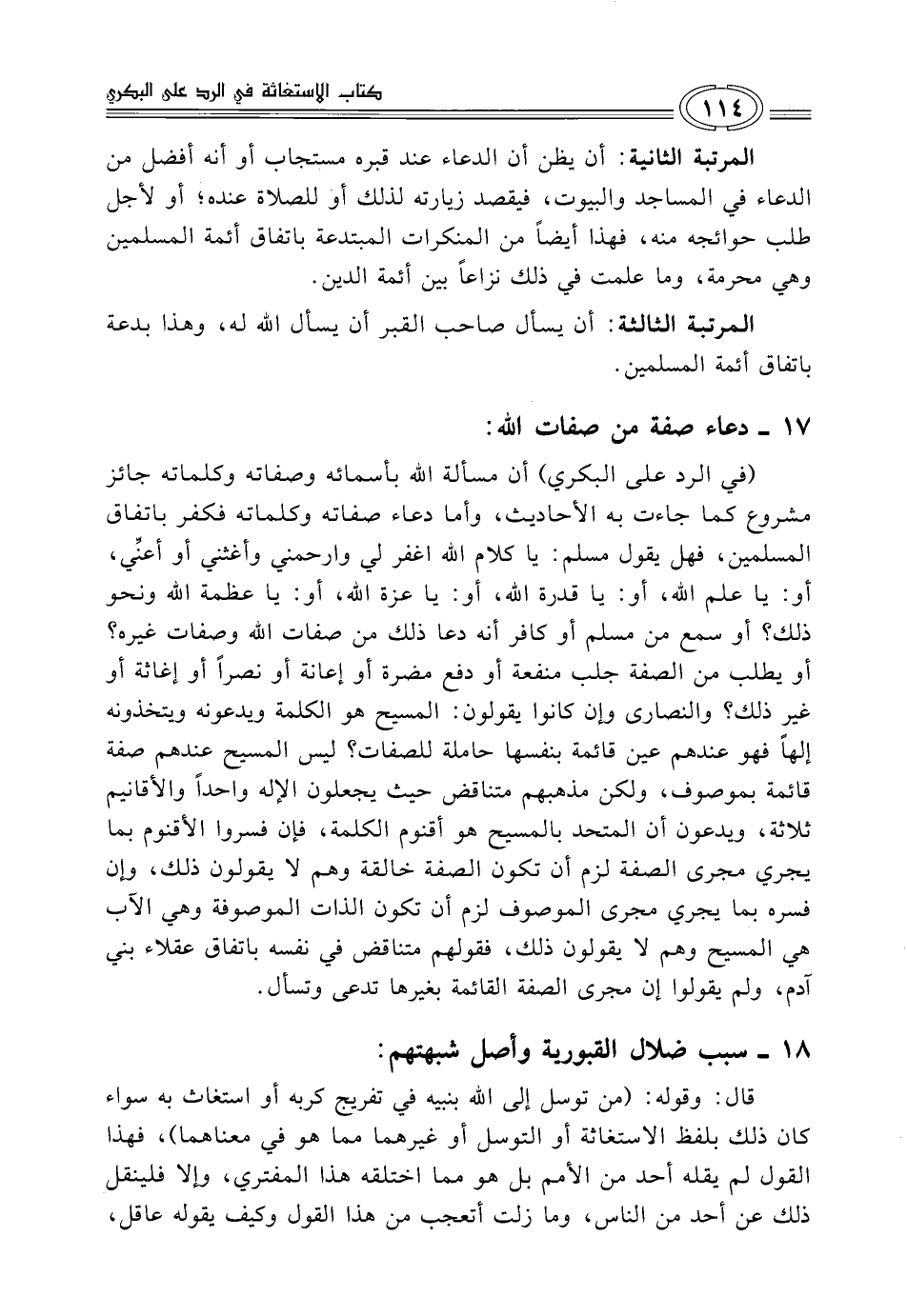 (في الرد على البكري) أن مسألة الله بأسمائه وصفاته وكلماته جائز مشروع كما جاءت به الأحاديث، وأما دعاء صفاته وكلماته فكفر باتفاق المسلمين، فهل يقول مسلم: يا كلام الله اغفر لي وارحمني وأغثني أو أعنِّي، أو: يا علم الله، أو: يا قدرة الله، أو: يا عزة الله، أو: يا عظمة الله ونحو ذلك؟ أو سمع من مسلم أو كافر أنه دعا ذلك من صفات الله وصفات غيره؟ أو يطلب من الصفة جلب منفعة أو دفع مضرة أو إعانة أو نصراً أو إغاثة أو غير ذلك؟ والنصارى وإن كانوا يقولون: المسيح هو الكلمة ويدعونه ويتخذونه إلهاً فهو عندهم عين قائمة بنفسها حاملة للصفات؟ ليس المسيح عندهم صفة قائمة بموصوف، ولكن مذهبهم متناقض حيث يجعلون الإله واحداً والأقانيم ثلاثة، ويدعون أن المتحد بالمسيح هو أقنوم الكلمة، فإن فسروا الأقنوم بما يجري مجرى الصفة لزم أن تكون الصفة خالقة وهم لا يقولون ذلك، وإن فسره بما يجري مجرى الموصوف لزم أن تكون الذات الموصوفة وهي الآب هي المسيح وهم لا يقولون ذلك، فقولهم متناقض في نفسه باتفاق عقلاء بني آدم، ولم يقولوا إن مجرى الصفة القائمة بغيرها تدعى وتسأل.