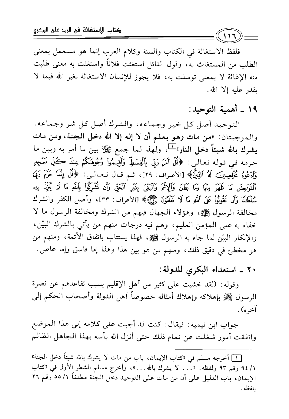 فلفظ الاستغاثة في الكتاب والسنة وكلام العرب إنما هو مستعمل بمعنى الطلب من المستغاث به، وقول القائل استغثت فلاناً واستغثت به معنى طلبت منه الإغاثة لا بمعنى توسلت به، فلا يجوز للإنسان الاستغاثة بغير الله فيما لا يقدر عليه إلا الله.