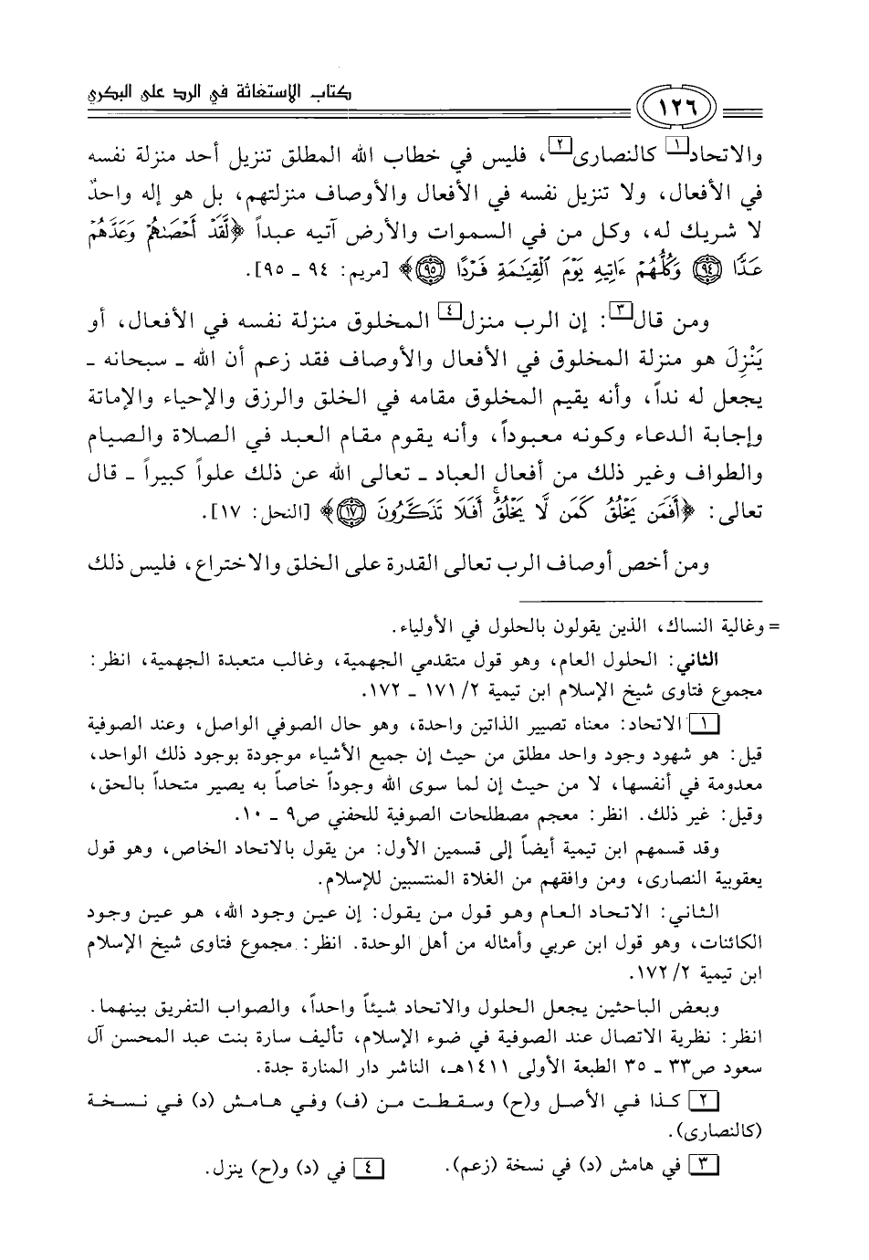 والاتحاد (¬1) كالنصارى (¬2)، فليس في خطاب الله المطلق تنزيل أحد منزلة نفسه في الأفعال، ولا تنزيل نفسه في الأفعال والأوصاف منزلتهم، بل هو إله واحدٌ لا شريك له، وكل من في السموات والأرض آتيه عبداً {لَقَدْ أَحْصَاهُمْ وَعَدَّهُمْ عَدًّا (94) وَكُلُّهُمْ آتِيهِ يَوْمَ الْقِيَامَةِ فَرْدًا (95)} [مريم: 94 - 95].