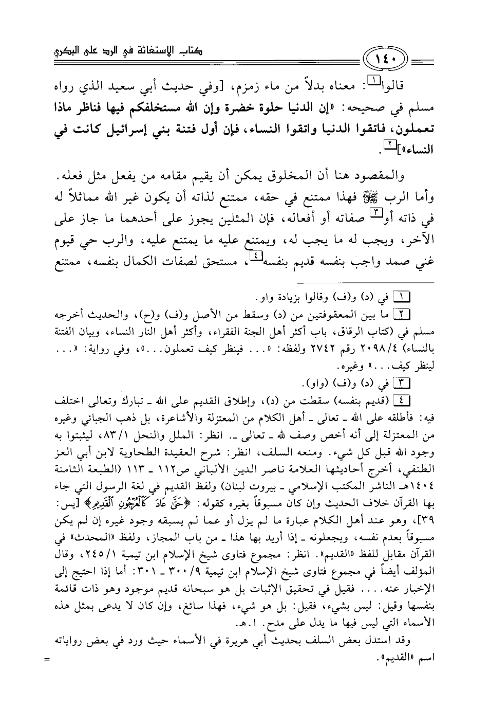(¬4) (قديم بنفسه) سقطت من (د)، وإطلاق القديم على الله -تبارك وتعالى- اختلف فيه: فأطلقه على الله -تعالى- أهل الكلام من المعنزلة والأشاعرة، بل ذهب الجبائي وغيره من المعتزلة إلى أنه أخص وصف لله -تعالى-. انظر: الملل والنحل 1/ 83، ليثبتوا به وجود الله قبل كل شيء. ومنعه السلف، انظر: شرح العقيدة الطحاوية لابن أبي العز الطنفي، أخرج أحاديثها العلامة ناصر الدين الألباني ص 112 - 113 (الطبعة الثامنة 1404 هـ الناشر المكتب الإسلامي - بيروت لبنان) ولفظ القديم في لغة الرسول التي جاء بها القرآن خلاف الحديث كان كان مسبوقاً بغيره كقوله: {حَتَّى عَادَ كَالْعُرْجُونِ الْقَدِيمِ} [يس: 39]، وهو عند أهل الكلام عبارة ما لم يزل أو عما لم يسبقه وجود غيره إن لم يكن مسبوقاً بعدم نفسه، ويجعلونه -إذا أريد بها هذا- من باب المجاز، ولفظ "المحدث" في القرآن مقابل للفظ "القديم". انظر: مجموع فتاوى شيخ الإسلام ابن تيمية 1/ 245، وقال المؤلف أيضاً في مجموع فتاوى شيخ الإسلام ابن تيمية 9/ 300 - 301: أما إذا احتيج إلى الإخبار عنه .... فقيل في تحقيق الإثبات بل هو سبحانه قديم موجود وهو ذات قائمة بنفسها وقيل: ليس بشيء، فقيل: بل هو شيء، فهذا سائغ، وإن كان لا يدعى بمثل هذه الأسماء التي ليس فيها ما يدل على مدح. أ. هـ.