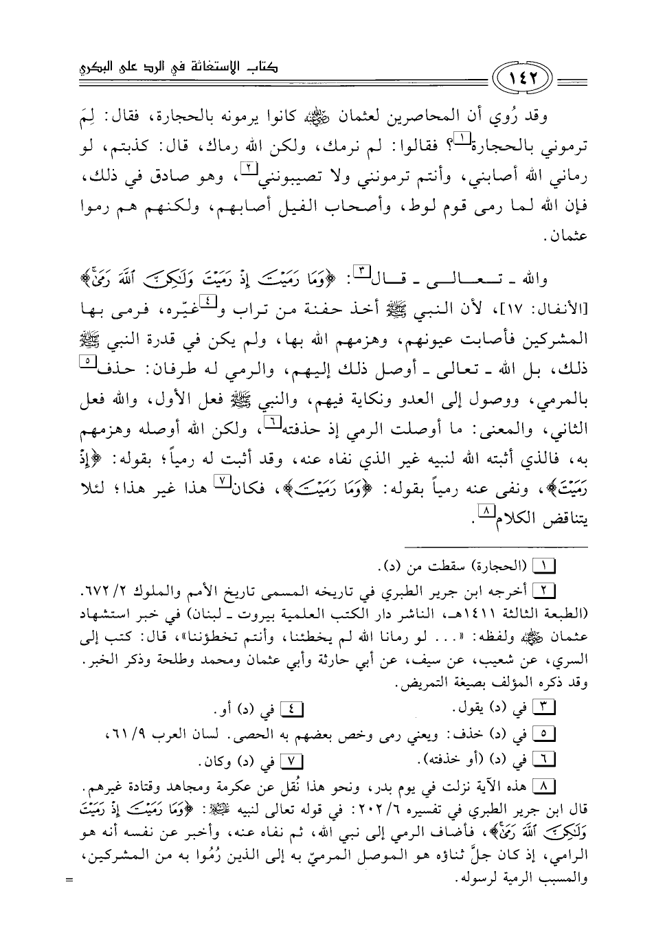 (الطبعة الثالثة 1411 هـ، الناشر دار الكتب العلمية بيروت - لبنان) في خبر استشهاد عثمان -رضي الله عنه- ولفظه: " ... لو رمانا الله لم يخطئنا، وأنتم تخطؤننا"، قال: كتب إلى السري، عن شعيب، عن سيف، عن أبي حارثة وأبي عثمان ومحمد وطلحة وذكر الخبر. وقد ذكره المؤلف بصيغة التمريض.