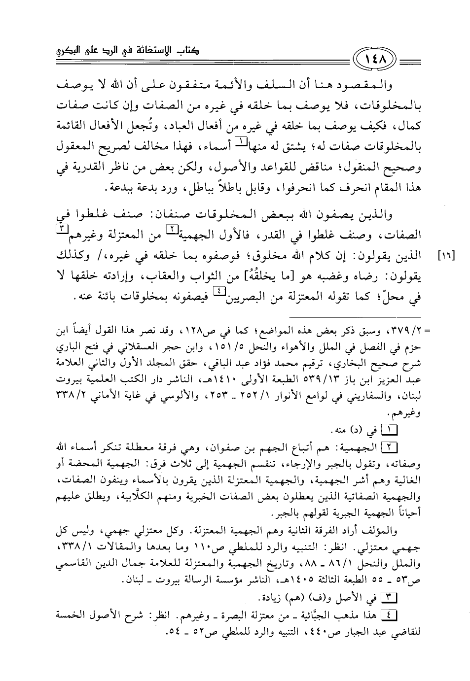 (¬2) الجهمية: هم أتباع الجهم بن صفوان، وهي فرقة معطلة تنكر أسماء الله وصفاته، وتقول بالجبر والإرجاء، تنقسم الجهمية إلى ثلاث فرق: الجهمية المحضة أو الغالية وهم أشر الجهمية، والجهمية المعتزلة الذين يقرون بالأسماء وينفون الصفات، والجهمية الصفاتية الذين يعطلون بعض الصفات الخبرية ومنهم الكلَّابية، ويطلق عليهم أحياناً الجهمية الجبرية لقولهم بالجبر.