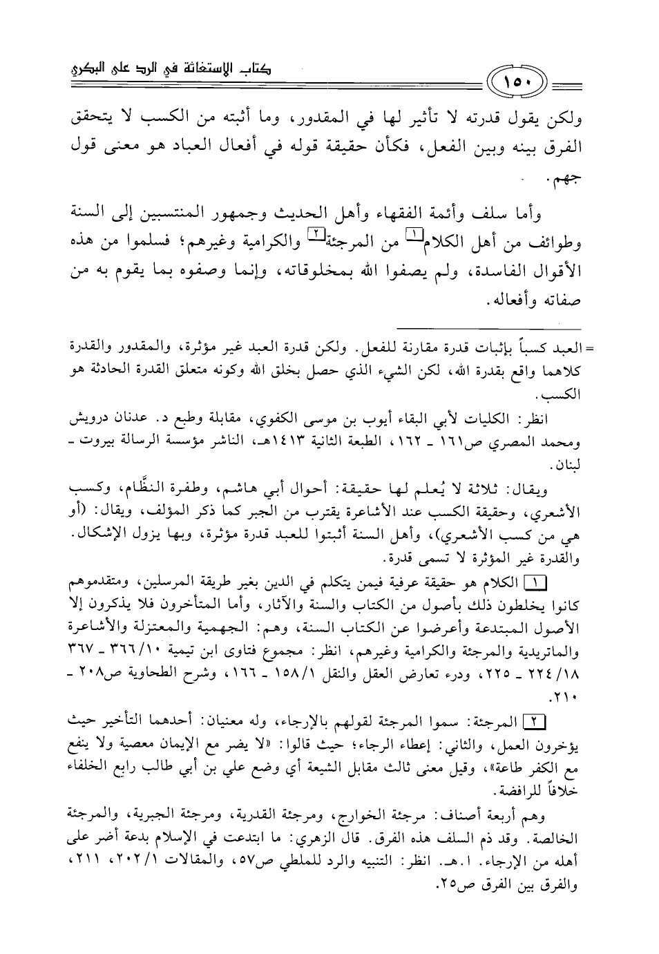 (¬1) الكلام هو حقيقة عرفية فيمن يتكلم في الدين بغير طريقة المرسلين، ومتقدموهم كانوا يخلطون ذلك بأصول من الكتاب والسنة والآثار، وأما المتأخرون فلا يذكرون إلا الأصول المبتدعة وأعرضوا عن الكتاب السنة، وهم: الجهمية والمعتزلة والأشاعرة والماتريدية والمرجئة والكرامية وغيرهم، انظر: مجموع فتاوى ابن تيمية 10/ 366 - 367، 18/ 224 - 225 ودرء تعارض العقل والنقل 1/ 158 - 166، وشرح الطحاوية ص 208 - 210.