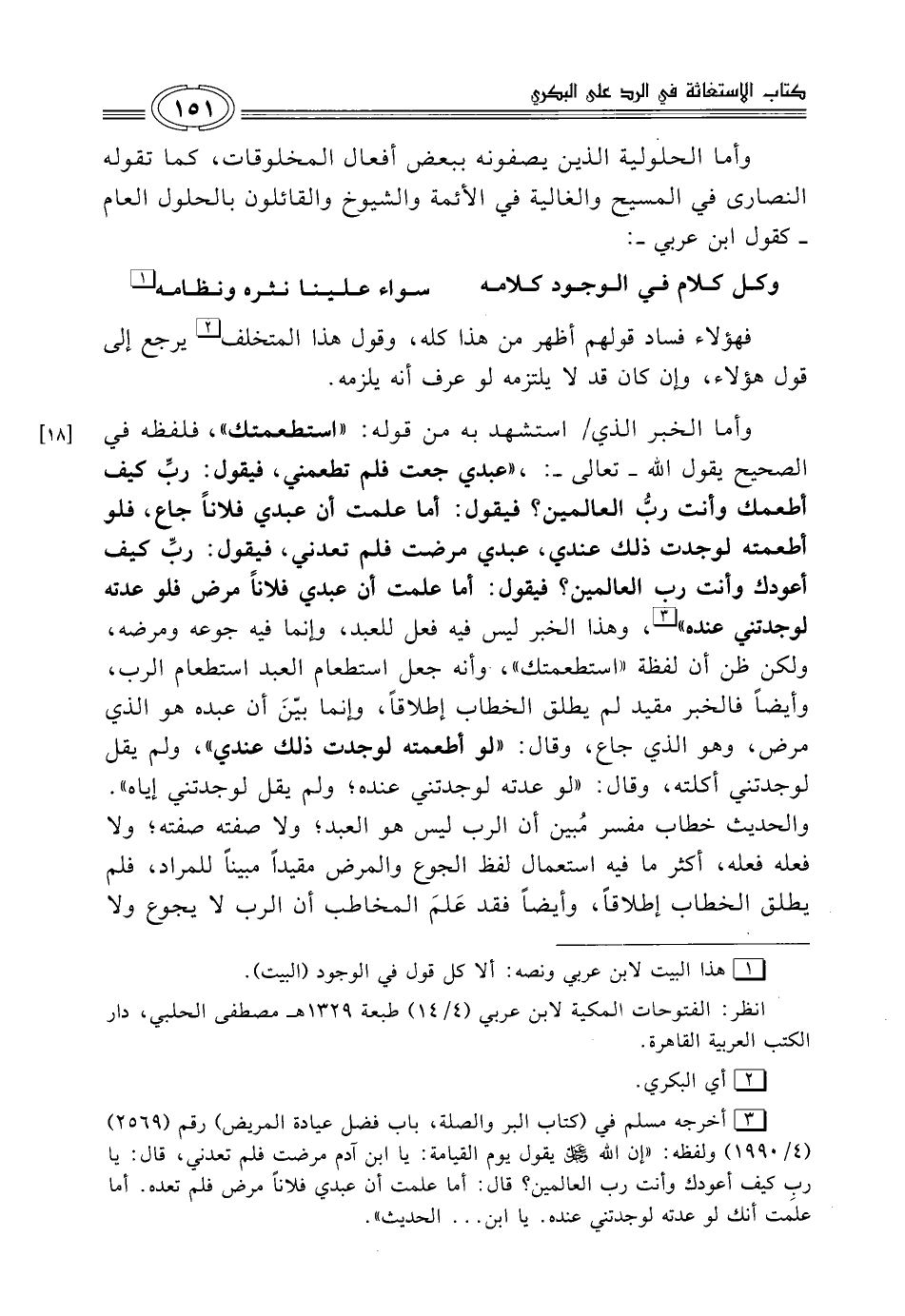 وأما الخبر الذي استشهد به من قوله: "استطعمتك"، فلفظه في الصحيح يقول الله -تعالى-: "عبدي جعت فلم تطعمني، فيقول: ربِّ كليف أطعمك وأنت ربُّ العالمين؟ فيقول: أما علمت أن عبدي فلاناً جاع، فلو أطعمته لوجدت ذلك عندي، عبدي مرضت فلم تعدني، فيقول: ربِّ كيف أعودك وأنت رب العالمين؟ فيقول: أما علمت أن عبدي فلاناً مرض فلو عدته لوجدتني عنده" (¬3)، وهذا الخبر ليس فيه فعل للعبد، وإنما فيه جوعه ومرضه، ولكن ظن أن لفظة "استطعمتك" وأنه جعل استطعام العبد استطعام الرب، وأيضاً فالخبر مقيد لم يطلق الخطاب إطلاقًا، وإنما بيّنَ أن عبده هو الذي مرض، وهو الذي جاع، وقال: "لو أطعمته لوجدت ذلك عندي"، ولم يقل لوجدتني أكلته، وقال: "لو عدته لوجدتني عنده؛ ولم يقل لوجدتني إياه".