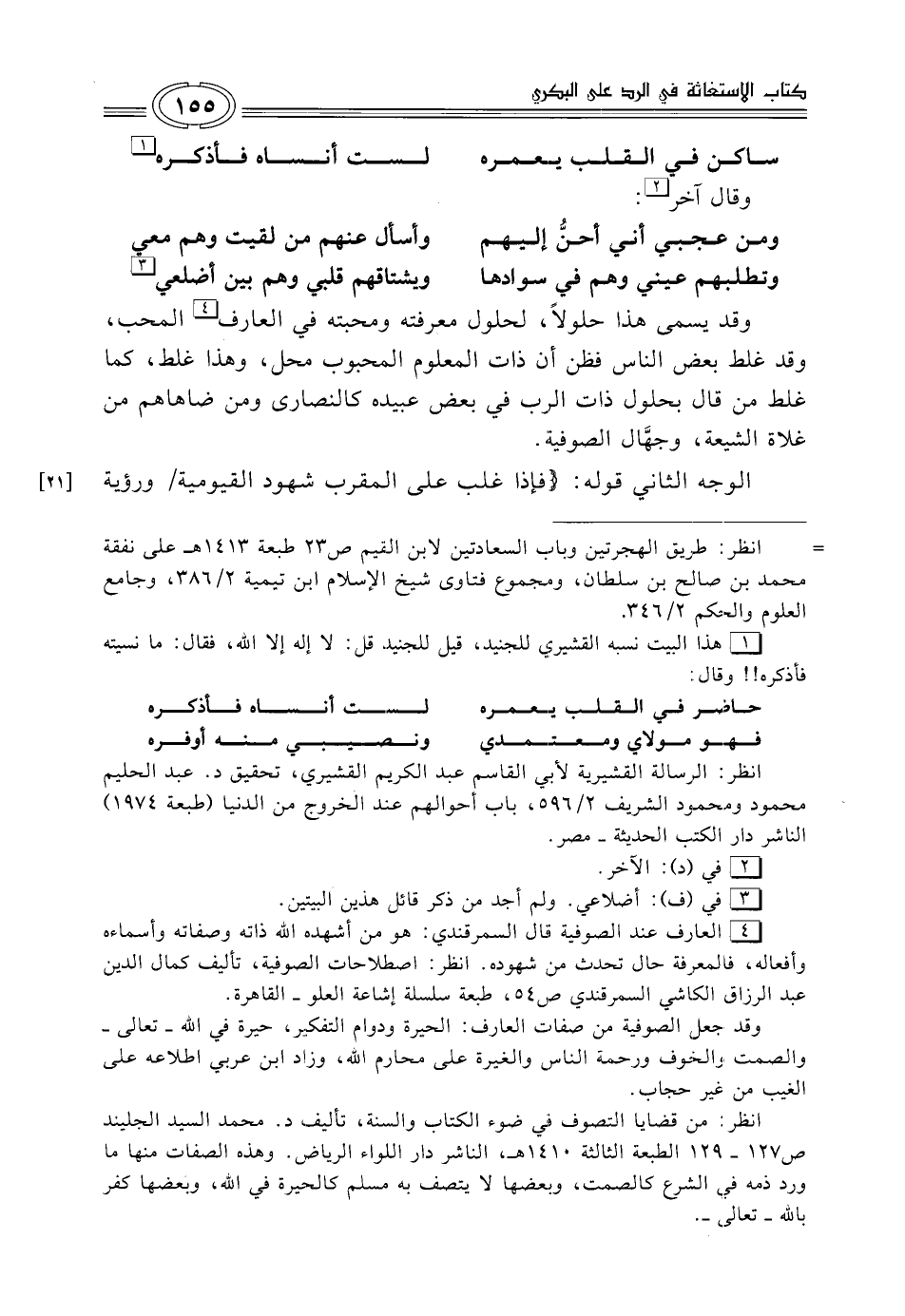 (¬4) العارف عند الصوفية قال السمرقندي: هو من أشهده الله ذاته وصفاته وأسماءه وأفعاله، فالمعرفة حال تحدث من شهوده. انظر: اصطلاحات الصوفية، تأليف كمال الدِّين عبد الرزّاق الكاشي السمرقندي ص 54، طبعة سلسلة إشاعة العلّو - القاهرة.