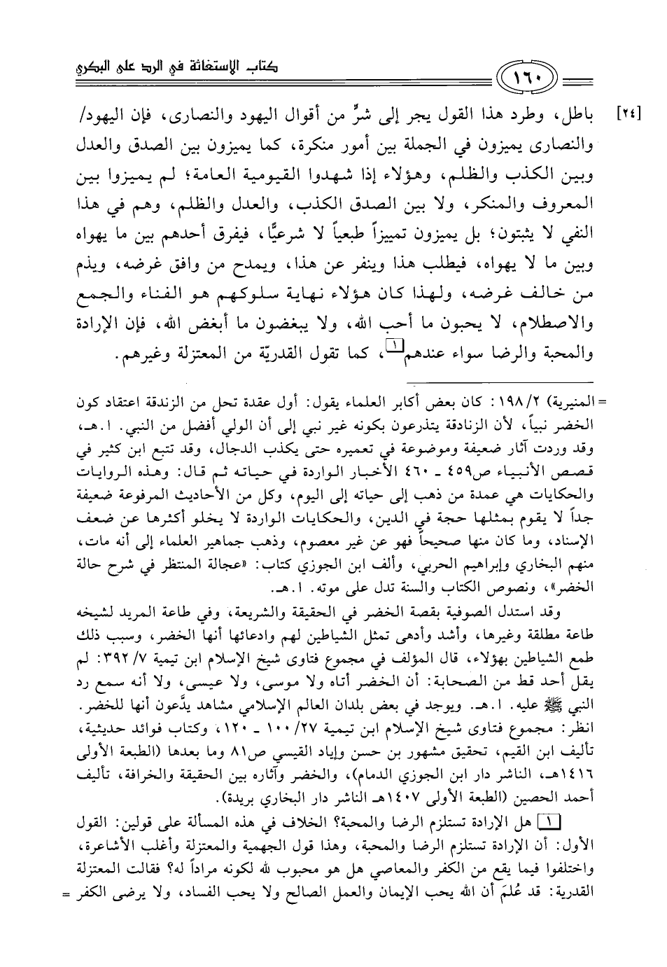 = المنيرية) 2/ 198: كان بعض أكابر العلماء يقول: أول عقدة تحل من الزندقة اعتقاد كون الخضر نبيًا، لأنّ الزنادقة يتذرعون بكونه غير نبي إلى أن الولي أفضل من النّبيّ. أ. هـ، وقد وردت آثار ضعيفة وموضوعة في تعميره حتّى يكذب الدجال، وقد تتبع ابن كثير في قصص الأنبياء ص 459 - 460 الأخبار الواردة في حياته ثمّ قال: وهذه الروايات والحكايات هي عمدة من ذهب إلى حياته إلى اليوم، وكل من الأحاديث المرفوعة ضعيفة جدًا لا يقوم بمثلها حجة في الدِّين، والحكايات الواردة لا يخلو أكثرها عن ضعف الإسناد، وما كان منها صحيحًا فهو عن غير معصوم، وذهب جماهير العلماء إلى أنّه مات، منهم البخاريّ وإبراهيم الحربيّ، وألف ابن الجوزي كتاب: "عجالة المنتظر في شرح حالة الخضر"، ونصوص الكتاب والسُّنَّة تدل على موته. أ. هـ.