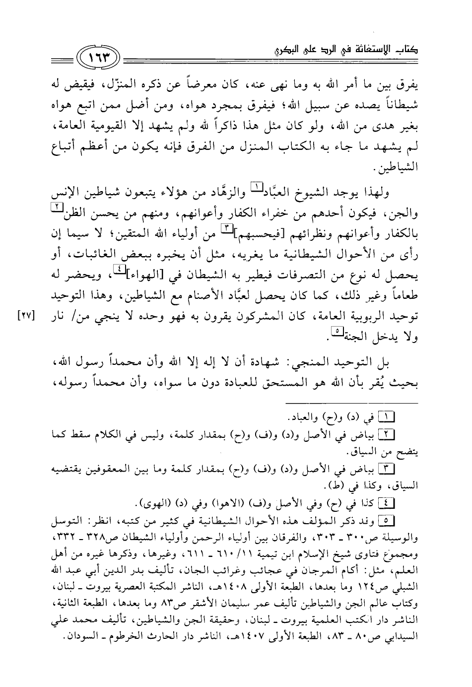 (¬5) وقد ذكر المؤلِّف هذه الأحوال الشيطانية في كثير من كتبه، انظر: التوسل والوسيلة، 300 - 303، والفرقان بين أولياء الرّحمن وأولياء الشيطان ص 328 - 332، ومجموع فتاوى شيخ الإسلام ابن تيمية 11/ 610 - 611، وغيرها، وذكرها غيره من أهل العلم، مثل: أكام المرجان في عجائب وغرائب الجان، تأليف بدر الدِّين أبي عبد الله الشبلي ص 124 وما بعدها، الطبعة الأولى 1408 هـ، الناشر المكتبة العصرية بيروت - لبنان، وكتاب عالم الجن والشياطن تأليف عمر سليمان الأشقر ص 83 وما بعدها، الطبعة الثّانية، الناشر دار الكتب العلمية بيروت - لبنان، وحقيقة الجن والشياطين، تأليف محمّد علي السيدابي ص 80 - 83، الطبعة الأولى 1407 هـ، الناشر دار الحارث الخرطوم - السودان.