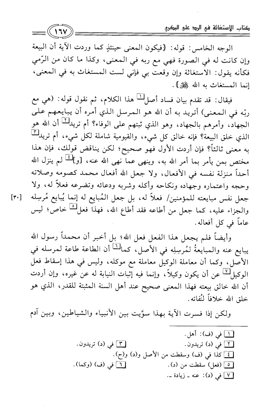الوجه الخامس: قوله: (فيكون المعنى حينئذٍ كما وردت الآية أن البيعة وإن كانت له في الصورة فهي مع ربه في المعنى، وكذا ما كان من الرّمي فكأنّه يقول: الاستغاثة وإن وقعت بي فإني لست المستغاث به في المعنى، إنّما المستغاث به الله -عَزَّ وجلَّ-).