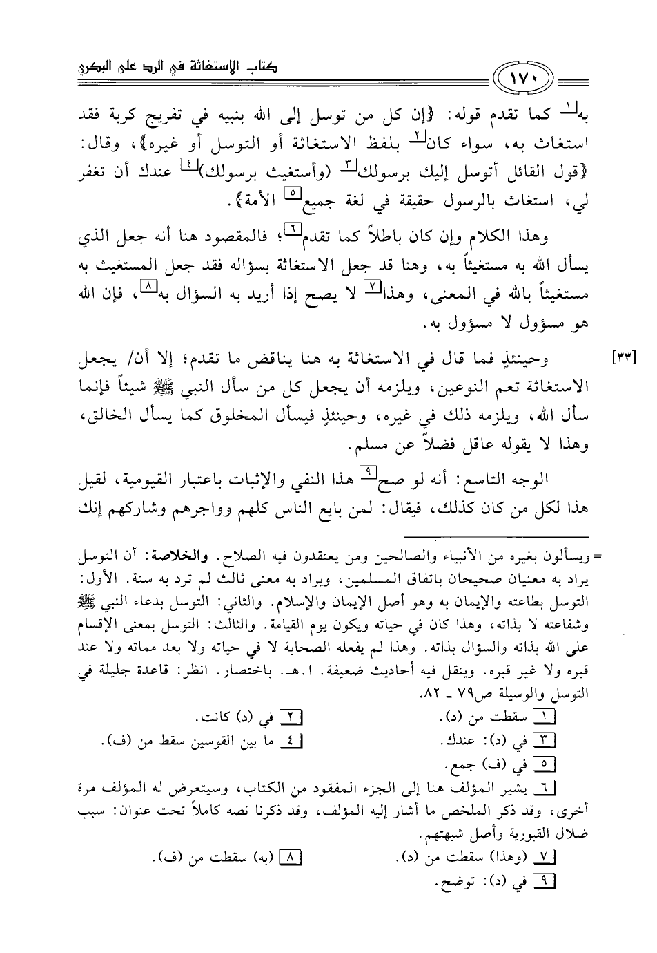(¬6) يشير المؤلِّف هنا إلى الجزء المففود من الكتاب، وسيتعرض له المؤلِّف مرّة أخرى، وقد ذكر الملخص ما أشار إليه المؤلِّف، وقد ذكرنا نصه كاملًا تحت عنوان: سبب ضلال القبورية وأصل شبهتهم.