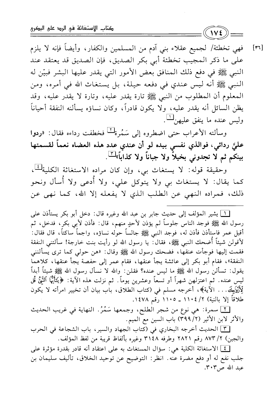 (¬4) الاستغاثة الكلية هي: سؤال المستغاث به على اعتقاد أنّه قادر بقدرة مؤثرة على جلب نفع له أو دفع مضرة عنه. انظر: التوضيح عن توحيد الخلاق، تأليف سليمان بن عبد الله ص 303.