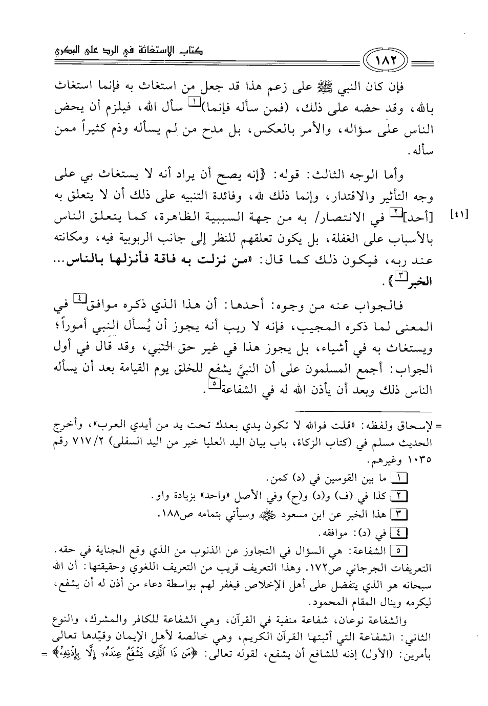 (¬5) الشفاعة: هي السؤال في التجاوز عن الذنوب من الّذي وقع الجناية في حقه. التعريفات الجرجاني ص 172. وهذا التعريف قريب من التعريف اللغوي وحقيقتها: أن الله سبحانه هو الّذي يتفضل على أهل الإخلاص فيغفر لهم بواسطة دعاء من أذن له أن يشفع، ليكرمه وينال المقام المحمود.