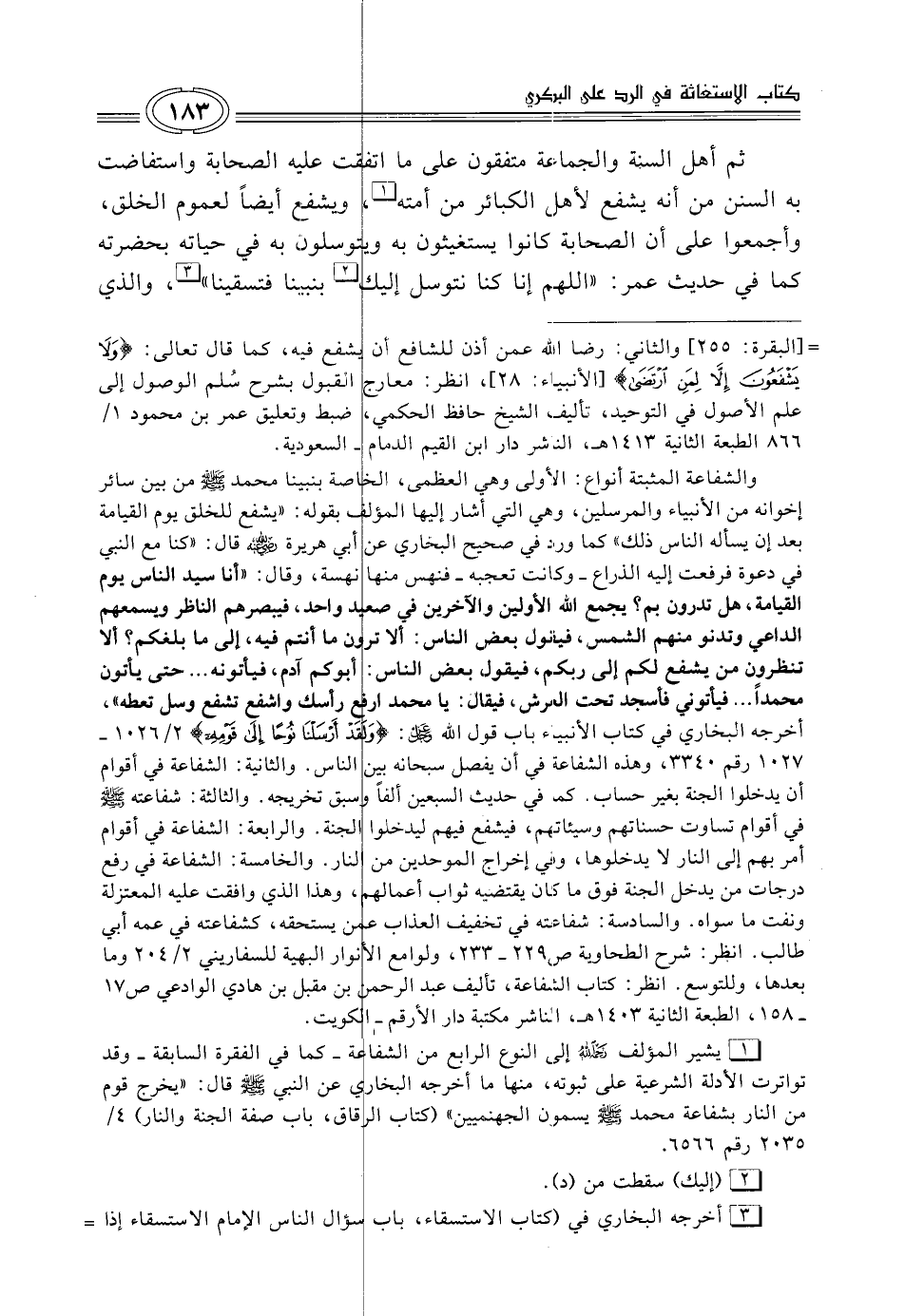 ثمّ أهل السُّنَّة والجماعة متفقون على ما اتفقت عليه الصّحابة واستفاضت به السنن من أنّه يشفع لأهل، الكبائر من أمته (¬1)، ويشفع أيضاً لعموم الخلق، وأجمعوا على أن الصحابة كانوا يستغيثون به ويتوسلون به في حياته بحضرته كما في حديث عمر: "اللهم إنا كنا نتوسل إليك (¬2) بنبينا فتسقينا" (¬3)، والذي