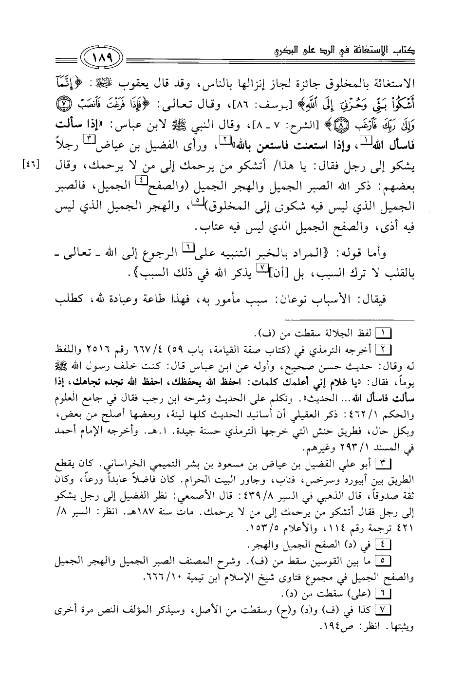 الاستغاثة بالمخلوق جائزة لجاز إنزالها بالناس، وقد قال يعقوب -عليه السلام-: {إِنَّمَا أَشْكُو بَثِّي وَحُزْنِي إِلَى اللَّهِ} [يوسف: 86]، وقال تعالى: {فَإِذَا فَرَغْتَ فَانْصَبْ (7) وَإِلَى رَبِّكَ فَارْغَبْ (8)} [الشرح: 7، 8]، وقال النّبيّ - صلى الله عليه وسلم - لابن عباس: "إذا سألت فاسأل الله (¬1)، وإذا استعنت فاستعن بالله" (¬2)، ورأى الفضيل بن عياض (¬3) رجلًا يشكو إلى رجل فقال: يا هذا أتشكو من يرحمك إلى من لا يرحمك، وقال بعضهم: ذكر الله الصبر الجميل والهجر الجميل (والصفح (¬4) الجميل، فالصبر الجميل الّذي ليس فيه شكوى إلى المخلوق) (¬5)، والهجر الجميل الّذي ليس فيه أذى، والصفح الجميل الذي ليس فيه عتاب.
