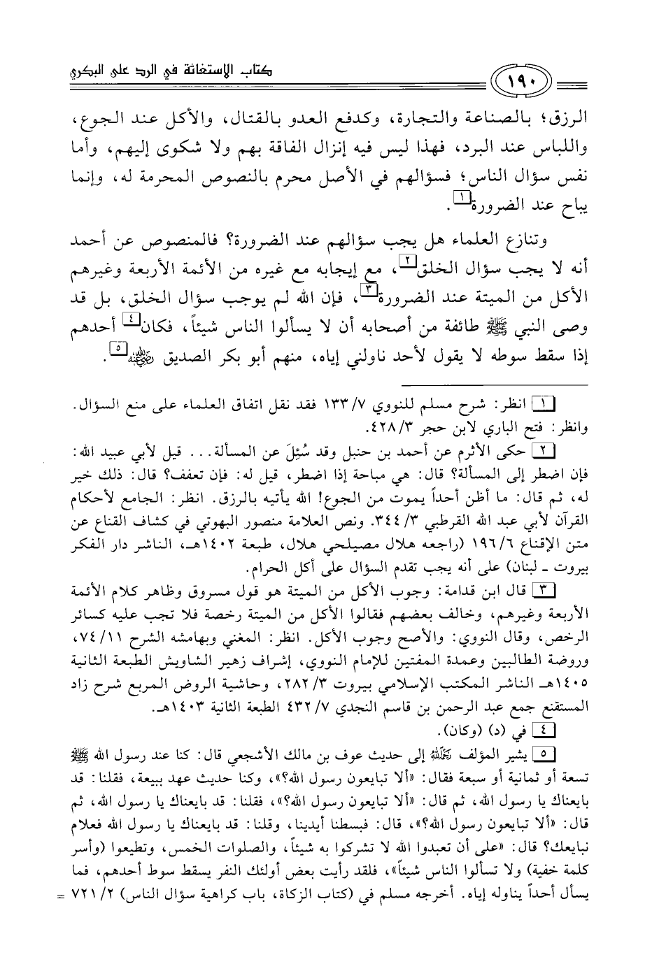 وتنازع العلماء هل يجب سؤالهم عند الضّرورة؟ فالمنصوص عن أحمد أنّه لا يجب سؤال الخلق (¬2)، مع إيجابه مع غيره من الأئمة الأربعة وغيرهم الأكل من الميِّتة عند الضّرورة (¬3)، فإن الله لم يوجب سؤال الخلق، بل قد وصى النّبيّ - صلى الله عليه وسلم - طائفة من أصحابه أن لا يسألوا النَّاس شيئًا، فكان (¬4) أحدهم إذا سقط سوطه لا يقول لأحد ناولني إياه، منهم أبو بكر الصديق -رضي الله عنه- (¬5).