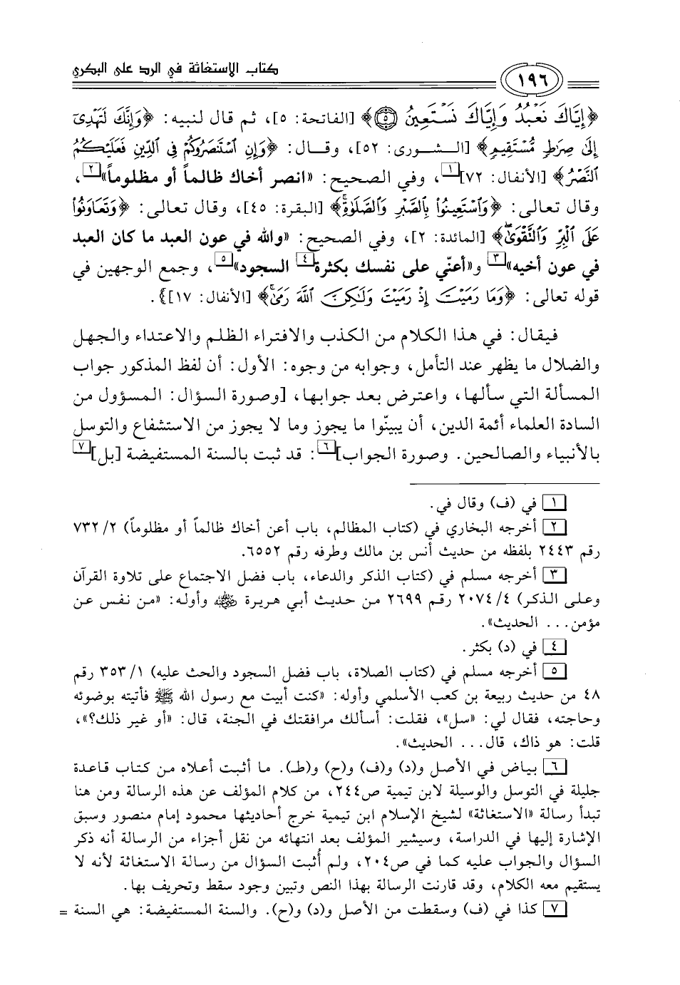 ما أثبت أعلاه من كتاب قاعدة جليلة في التوسل والوسيلة لابن تيمية ص 244، من كلام المؤلِّف عن هذه الرسالة ومن هنا تبدأ رسالة "الاستغاثة" لشيخ الإسلام ابن تيمية خرج أحاديثها محمود إمام منصور وسبق الإشارة إليها في الدراسة، وسيشير المؤلِّف بعد انتهائه من نقل أجزاء من الرسالة أنّه ذكر السؤال والجواب عليه كما في ص 204، ولم أُثبت السؤال من رسالة الاستغاثة لأنّه لا يستقيم معه الكلام، وقد قارنت الرسالة بهذا النص وتبين وجود سقط وتحريف بها.
