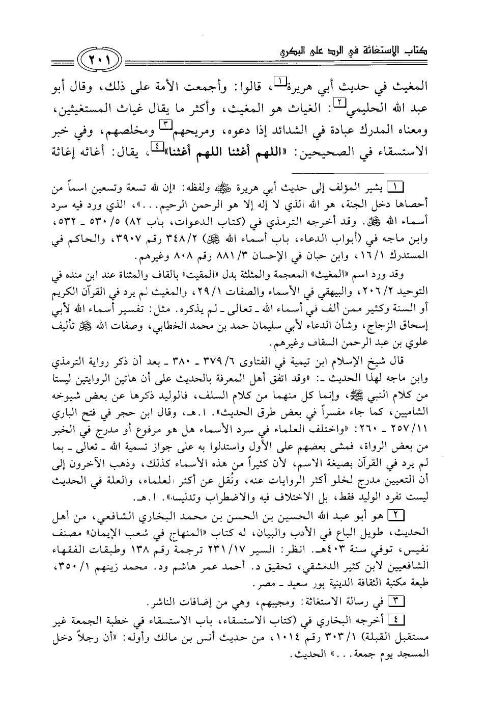 (¬1) يشير المؤلف إلي حديث أبي هريرة -رضي الله عنه- ولفظه: "إن لله تسعة وتسعين اسمًا من أحصاها دخل الجنة، هو الله الذي لا إله إلا هو الرحمن الرحيم ... "، الذي ورد فيه سرد أسماء الله -عز وجل-. وقد أخرجته الترمذي في (كتاب الدعوات، باب 82) 5/ 530 - 532، وابن ماجه في (أبواب الدعاء، باب أسماء الله -عز وجل-) 2/ 348 رقم 3907، والحاكم في المستدرك 1/ 16، وابن حبان في الإحسان 3/ 881 رقم 808 وغيرهم.