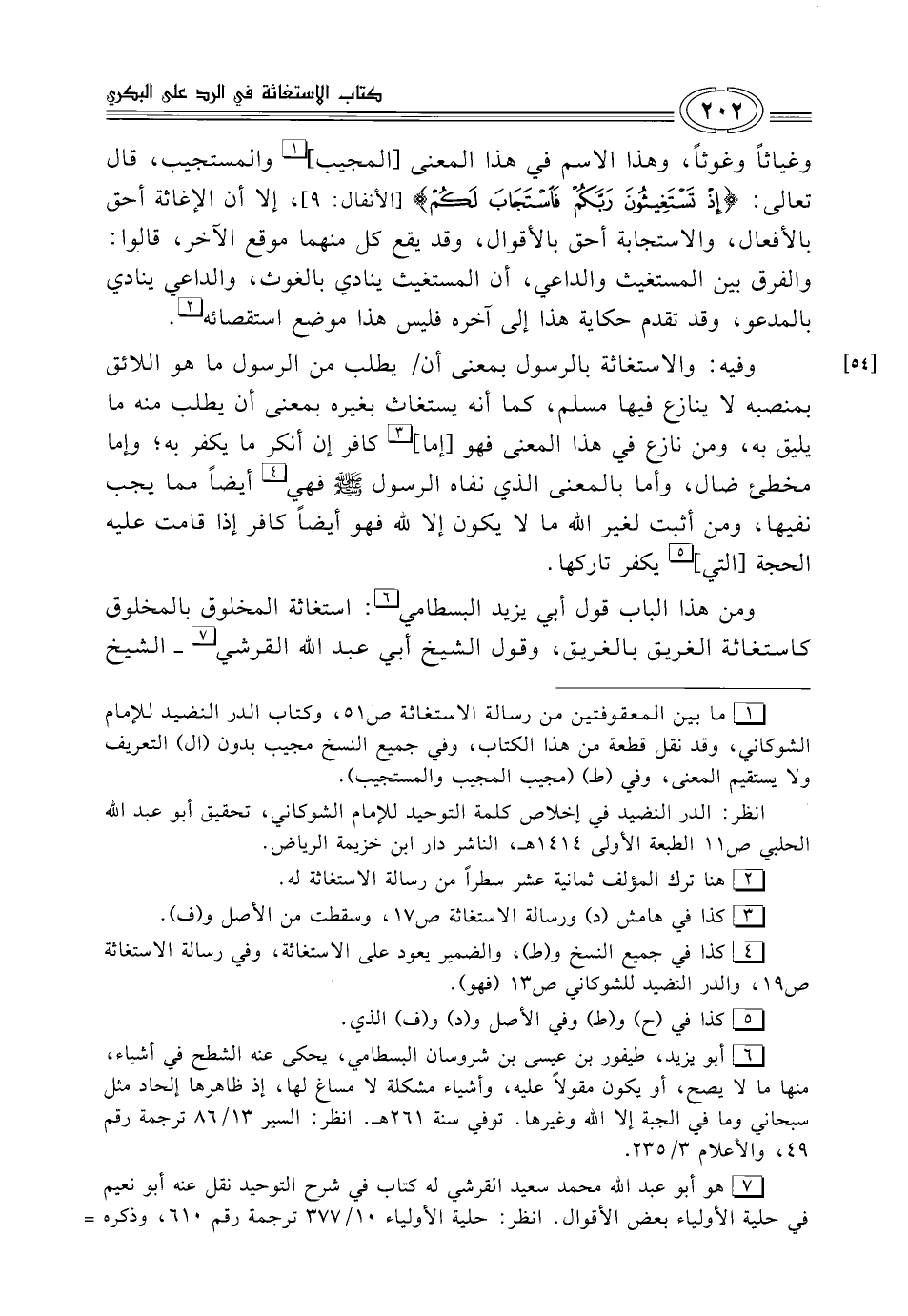 وفيه: والاستغاثة بالرسول بمعنى أن يطلب من الرسول ما هو اللائق بمنصبه لا ينازع فيها مسلم، كما أنه يستغاث بغيره بمعنى أن يطلب منه ما يليق به، ومن نازع في هذا المعنى فهو [إما] (¬3) كافر إن أنكر ما يكفر به؛ وإما مخطئ ضال، وأما بالمعنى الذي نفاه الرسول - صلى الله عليه وسلم - فهي (¬4) أيضاً مما يجب نفيها، ومن أثبت لغير الله ما لا يكون إلا لله فهو أيضاً كافر إذا قامت عليه الحجة [التي] (¬5) يكفر تاركها.