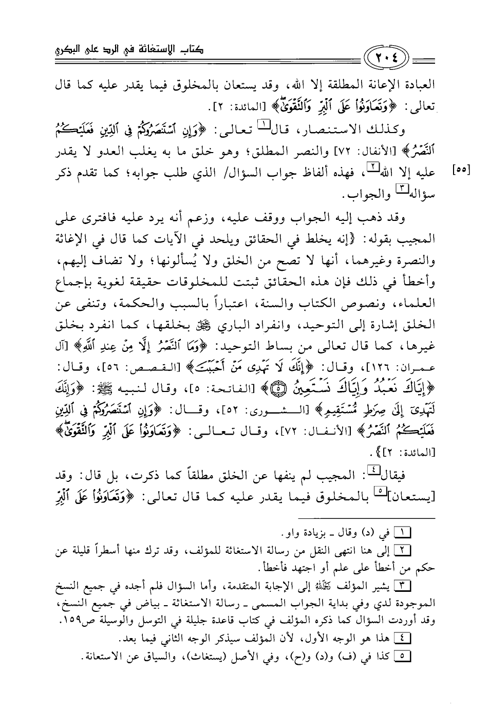 وقد ذهب إليه الجواب ووقف عليه، وزعم أنه يرد عليه فافترى على المجيب بقوله: (إنه يخلط في الحقائق ويلحد في الآيات كما قال في الإغاثة والنصرة وغيرهما، أنها لا تصح من الخلق ولا يُسألونها؛ ولا تضاف إليهم، وأخطأ في ذلك فإن هذه الحقائق ثبتت للمخلوقات حقيقة لغوية بإجماع العلماء، ونصوص الكتاب والسنة، اعتبارًا بالسبب والحكمة، وتنفى عن الخلق إشارة إلى التوحيد، وانفراد الباري -عز وجل- بخلقها، كما انفرد بخلق غيرها، كما قال تعالى من بساط التوحيد: {وَمَا النَّصْرُ إِلَّا مِنْ عِنْدِ اللَّهِ} [آل عمران: 126]، وقال: {إِنَّكَ لَا تَهْدِي مَنْ أَحْبَبْتَ} [القصص: 56]، وقال: {إِيَّاكَ نَعْبُدُ وَإِيَّاكَ نَسْتَعِينُ (5)} [الفاتحة: 5]، وقال لنبيه - صلى الله عليه وسلم -: {وَإِنَّكَ لَتَهْدِي إِلَى صِرَاطٍ مُسْتَقِيمٍ} [الشورى: 52]، وقال: {وَإِنِ اسْتَنْصَرُوكُمْ فِي الدِّينِ فَعَلَيْكُمُ النَّصْرُ} [الأنفال: 72]، وقال تعالى: {وَتَعَاوَنُوا عَلَى الْبِرِّ وَالتَّقْوَى} [المائدة: 2]).