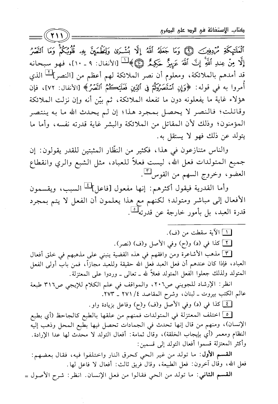 (¬5) اختلف المعتزلة في المتولدات فمنهم من علقها بالطبع كالجاحظ (أي بطبع الإنسان)، ومنهم من قال إنها تحدث في الجمادات تحصل فيها بطبع المحل وذهب إليه النظام ومعمر (أي بإيجاب الخلقة)، وقال ثمامة: أفعال التولد لا محدث لها عدا الإرادة.
