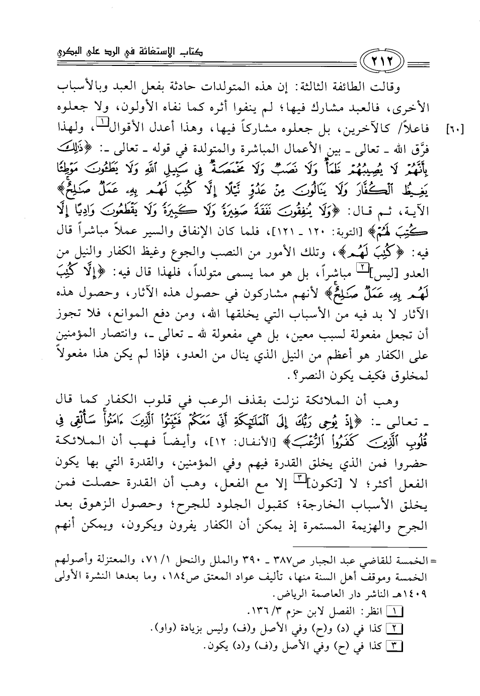 وهب أن الملائكة نزلت بقذف الرعب في قلوب الكفار كما قال -تعالى-: {إِذْ يُوحِي رَبُّكَ إِلَى الْمَلَائِكَةِ أَنِّي مَعَكُمْ فَثَبِّتُوا الَّذِينَ آمَنُوا سَأُلْقِي فِي قُلُوبِ الَّذِينَ كَفَرُوا الرُّعْبَ} [الأنفال: 12]، وأيضًا فهب أن الملائكة حضروا فمن الذي يخلق القدرة فيهم وفي المؤمنين، والقدرة التي بها يكون الفعل أكثر؛ لا [تكون] (¬3) إلا مع الفعل، وهب أن القدرة حصلت فمن يخلق الأسباب الخارجة؛ كقبول الجلود للجرح، وحصول الزهوق بعد الجرح والهزيمة المستمرة إذ يمكن أن الكفار يفرون ويكرون، ويمكن أنهم