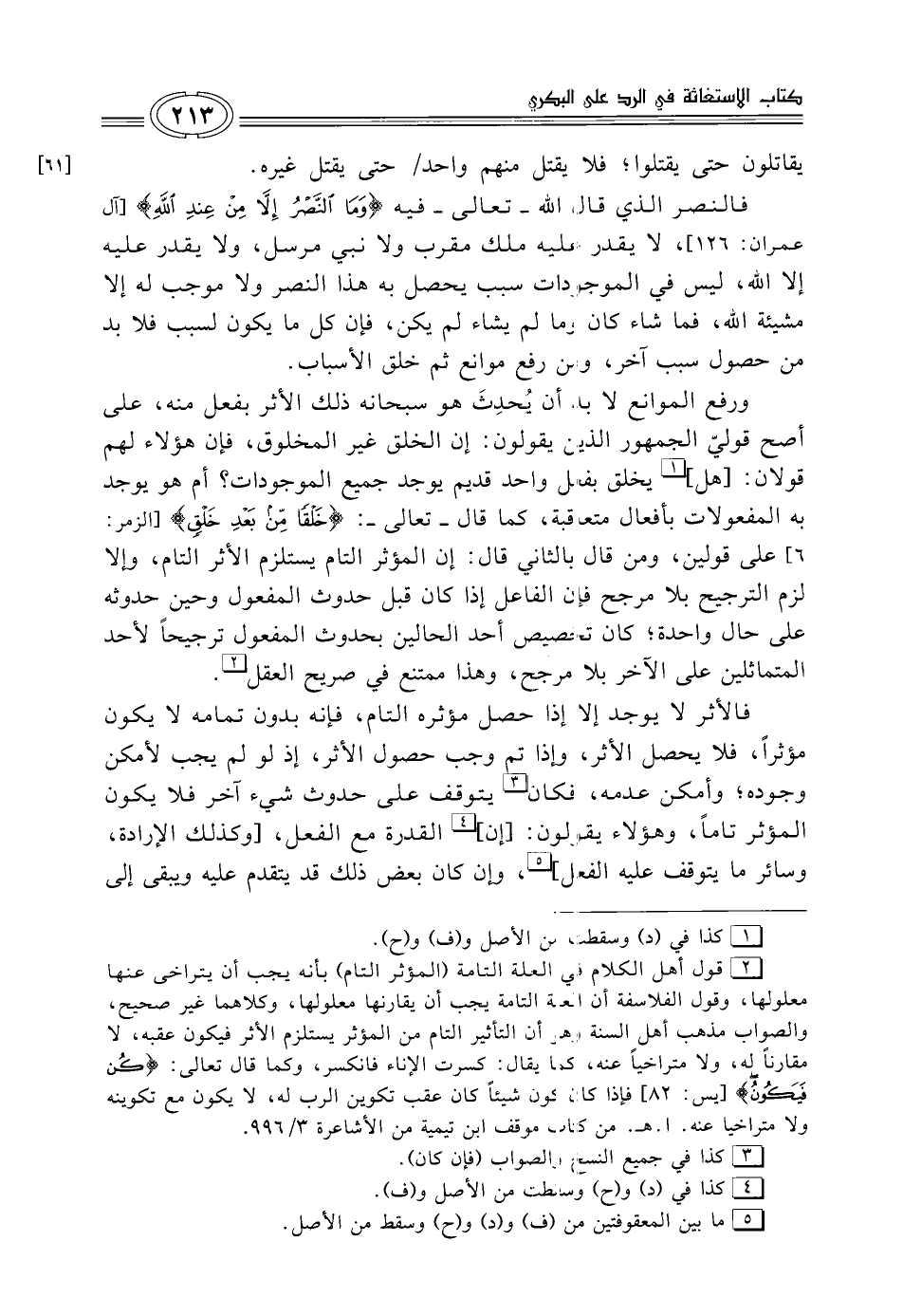 (¬2) قول أهل الكلام في العلة التامة (المؤثر التام) بأنه يجب أن يتراخى عنها معلولها، وقول الفلاسفة أن العلة التامة يجب أن يقارنها معلولها، وكلاهما غير صحيح، والصواب مذهب أهل السنة وهو أن التأثير التام من المؤثر يستلزم الأثر فيكون عقبه، لا مقارنًا له، ولا متراخيًا عنه، كما يقال: كسرت الإناء فانكسر، وكما قال تعالى: {كُنْ فَيَكُونُ} [يس: 82] فإذا كان كون شيئًا كان عقب تكوين الرب له، لا يكون مع تكوينه ولا متراخيا عنه. أ. هـ. من كتاب موقف ابن تيمية من الأشاعرة 3/ 996.