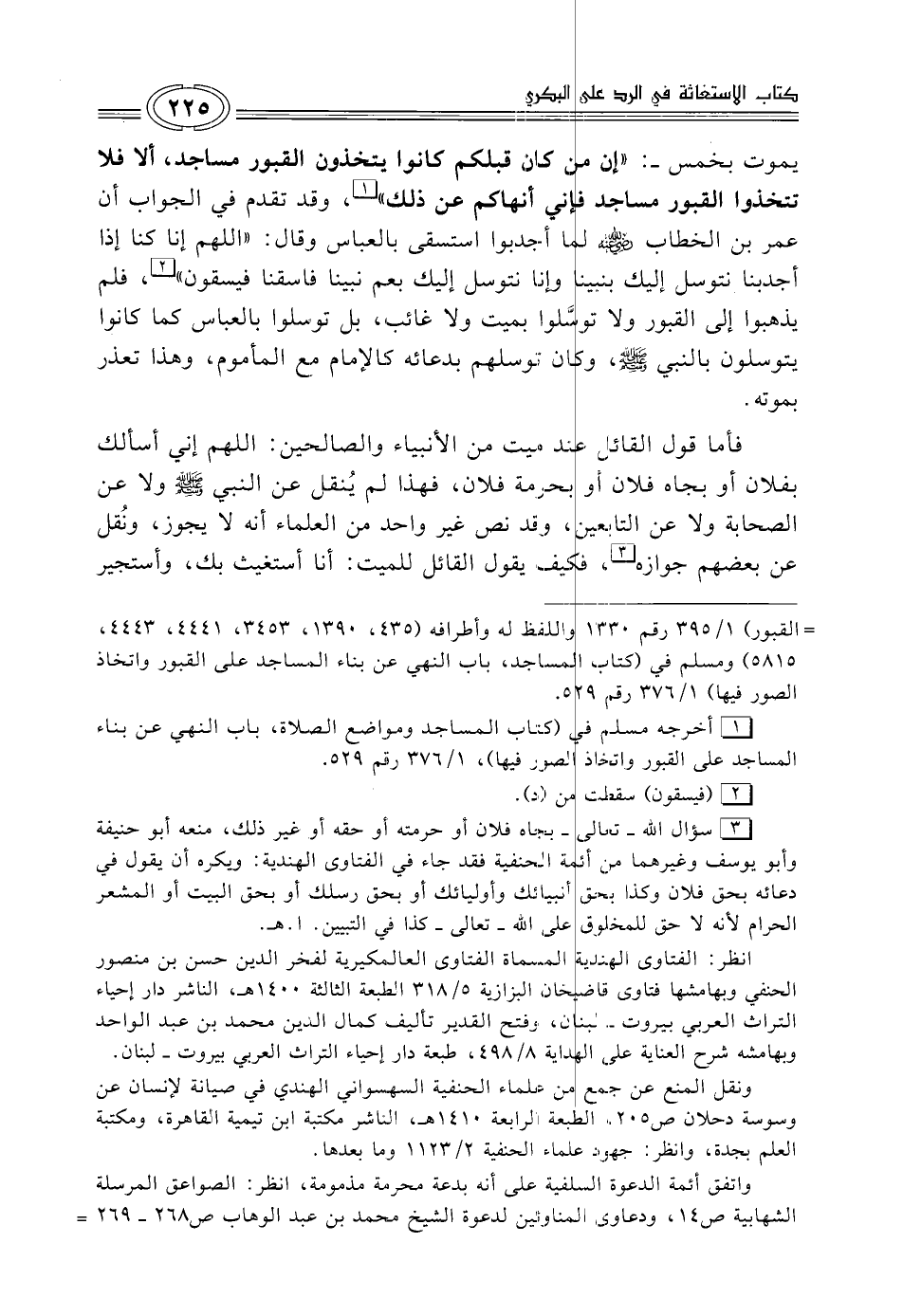 يموت بخمس-: "إن من كان قبلكم كانوا يتخذون القبور مساجد، ألا فلا تتخذوا القبور مساجد فإني أنهاكم عن ذلك" (¬1)، وقد تقدم في الجواب أن عمر بن الخطاب -رضي الله عنه- لما أجدبوا استسقى بالعباس وقال: "اللهم إنا كنا إذا أجدبنا نتوسل إليك بنبينا وإنا نتوسل إليك بعم نبينا فاسقنا فيسقون" (¬2)، فلم يذهبوا إلي القبور ولا توسَّلوا بميت ولا غائب، بل توسلوا بالعباس كما كانوا يتوسلون بالنبي - صلى الله عليه وسلم - , وكان توسلهم بدعائه كالإمام مع المأموم, وهذا تعذر بموته.