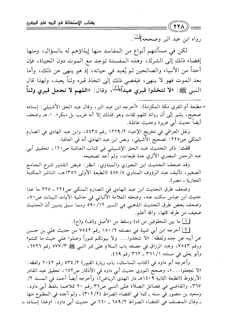 (¬2) أخرجه ابن أبي شيبة في مصنفه 2/ 150 رقم 7542 من حديث علي بن حسين عن أبيه عن جده ولفظه: "لا تتخذوا ... ولا بيوتكم قبورًا وصلوا علي حيث ما كنتم" ورقم 7543، وعبد الرزاق في مصنفه باب السلام على قبر النبي - صلى الله عليه وسلم -3/ 577 رقم 6726، وأبو يعلى في مسنده 1/ 361 - 362 رقم 469.