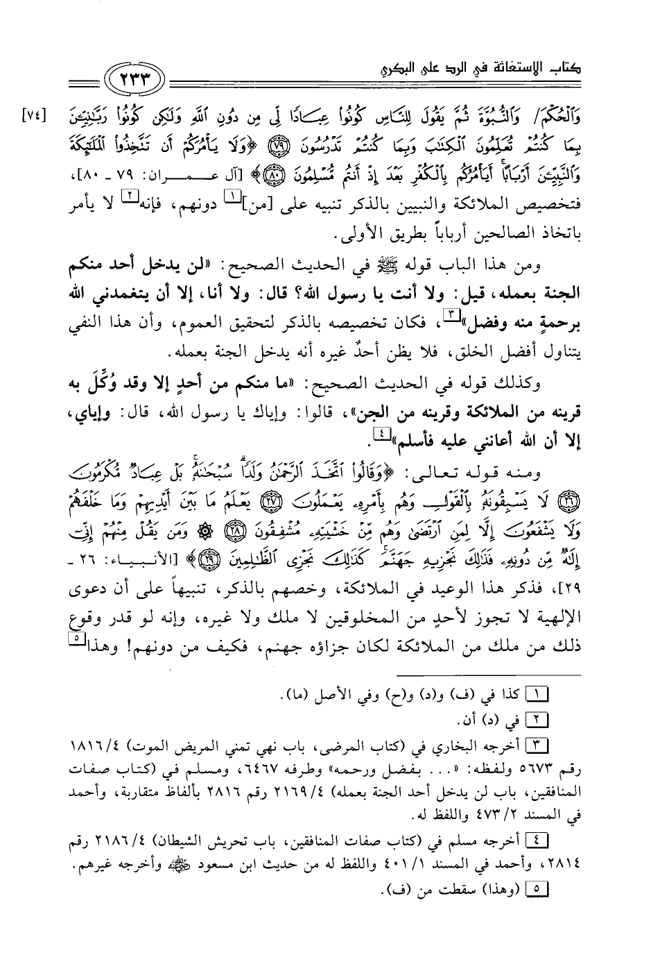 وَالْحُكْمَ وَالنُّبُوَّةَ ثُمَّ يَقُولَ لِلنَّاسِ كُونُوا عِبَادًا لِي مِنْ دُونِ اللَّهِ وَلَكِنْ كُونُوا رَبَّانِيِّينَ بِمَا كُنْتُمْ تُعَلِّمُونَ الْكِتَابَ وَبِمَا كُنْتُمْ تَدْرُسُونَ (79) وَلَا يَأْمُرَكُمْ أَنْ تَتَّخِذُوا الْمَلَائِكَةَ وَالنَّبِيِّينَ أَرْبَابًا أَيَأْمُرُكُمْ بِالْكُفْرِ بَعْدَ إِذْ أَنْتُمْ مُسْلِمُونَ (80)} [آل عمران: 79، 80] فتخصيص الملائكة والنبيين بالذكر تنبيه على [من] (¬1) دونهم، فإنه (¬2) لا يأمر باتخاذ الصالحين أربابًا بطريق الأولى.