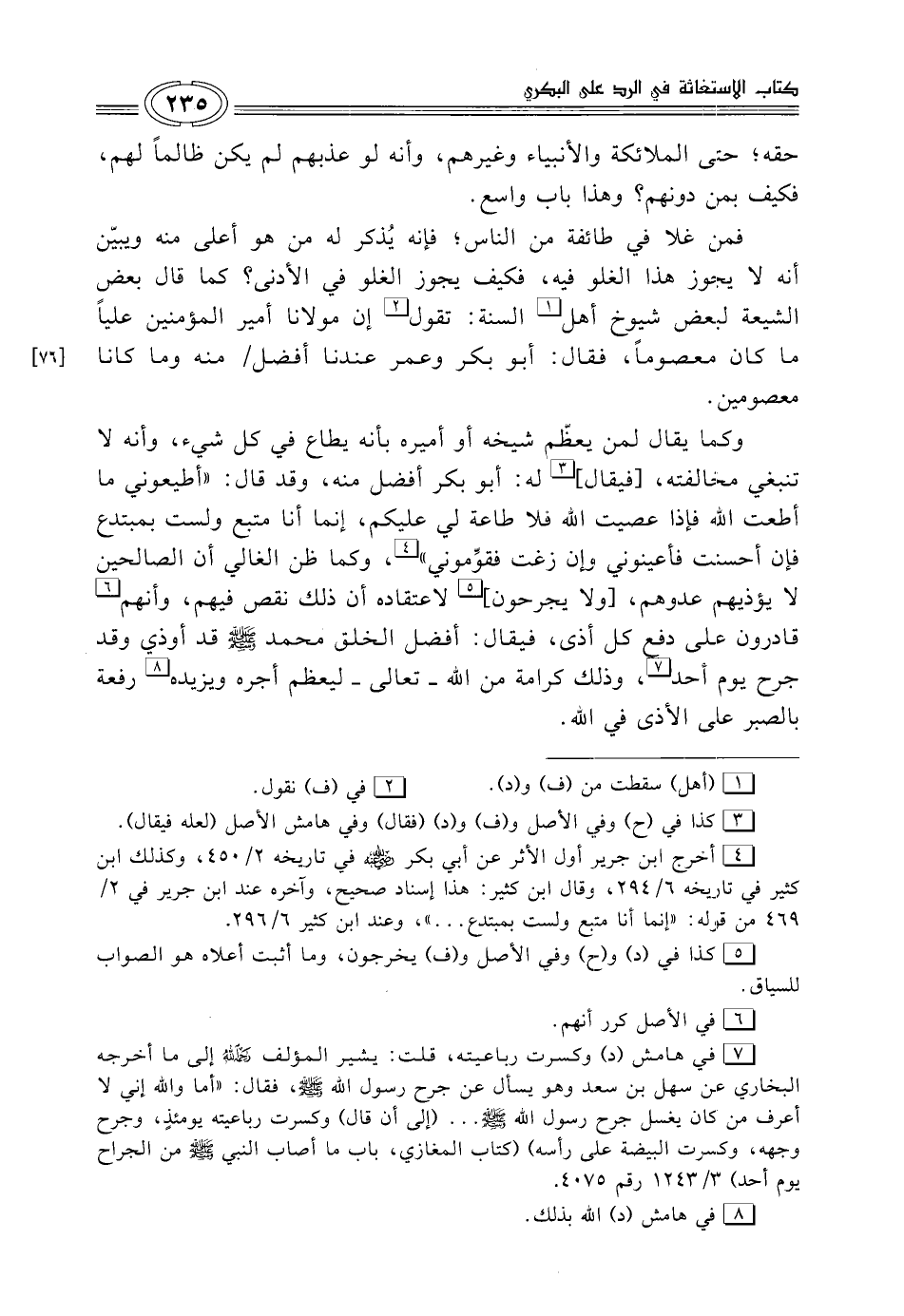 وكما يقال لمن يعظّم شيخه أو أميره بأنه يطاع في كل شيء، وأنه لا تنبغي مخالفته، [فيقال] (¬3) له: أبو بكر أفضل منه، وقد قال: "أطيعوني ما أطعت الله فإذا عصيت الله فلا طاعة لي عليكم، إنما أنا متبع ولست بمبتدع فإن أحسنت فأعينوني وإن زغت فقوِّموني" (¬4)، وكما ظن الغالي أن الصالحين لا يؤذيهم عدوهم، [ولا يجرحون] (¬5) لاعتقاده أن ذلك نقص فيهم، وأنهم (¬6) قادرون علي دفع كل أذى، فيقال: أفضل الخلق محمد - صلى الله عليه وسلم - قد أوذي وقد جرح يوم أحد (¬7)، وذلك كرامة من الله -تعالى- ليعظم أجره ويزيده (¬8) رفعة بالصبر على الأذى في الله.