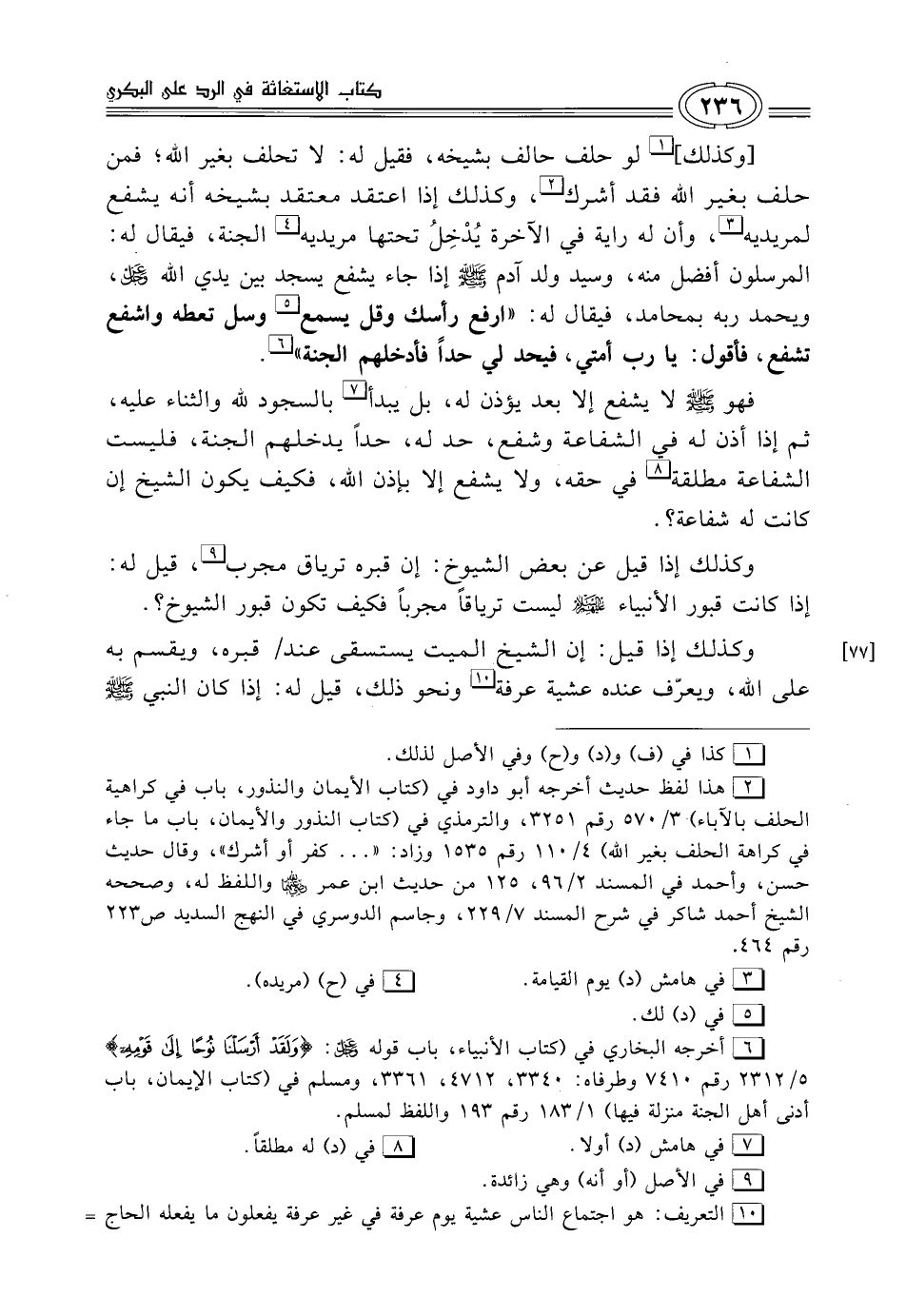 [وكذلك] (¬1) لو حلف حالف بشيخه، فقيل له: لا تحلف بغير الله؛ فمن حلف بغير الله فقد أشرك (¬2)، وكذلك إذا اعتقد معتقد بشيخه أنه يشفع لمريديه (¬3)، وأن له راية في الآخرة يُدْخِلُ تحتها مريديه (¬4) الجنة، فيقال له: المرسلون أفضل منه، وسيد ولد آدم - صلى الله عليه وسلم - إذا جاء يشفع يسجد بين يدي الله -عز وجل-، ويحمد ربه بمحامد، فيقال له: "ارفع رأسك وقل يسمع (¬5) وسل تعطه واشفع تشفع، فأقول: يا رب أمتي، فيحد لي حدًا فأدخلهم الجنة" (¬6).