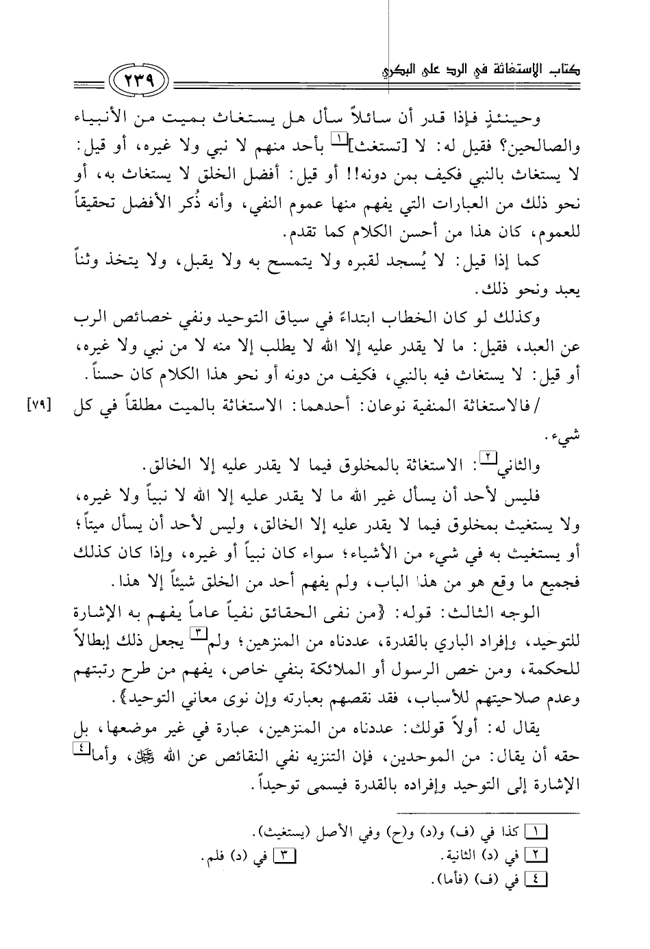 وحينئذٍ فإذا قدر أن سائلًا سأل هل يستغاث بميت من الأنبياء والصالحين؟ فقيل له: لا [تستغث] (¬1) بأحد منهم لا نبي ولا غيره، أو قيل: لا يستغاث بالنبي فكيف بمن دونه!! أو قيل: أفضل الخلق لا يستغاث به، أو نحو ذلك من العبارات التي يفهم منها عموم النفي، وأنه ذُكر الأفضل تحقيقًا للعموم، كان هذا من أحسن الكلام كما تقدم.