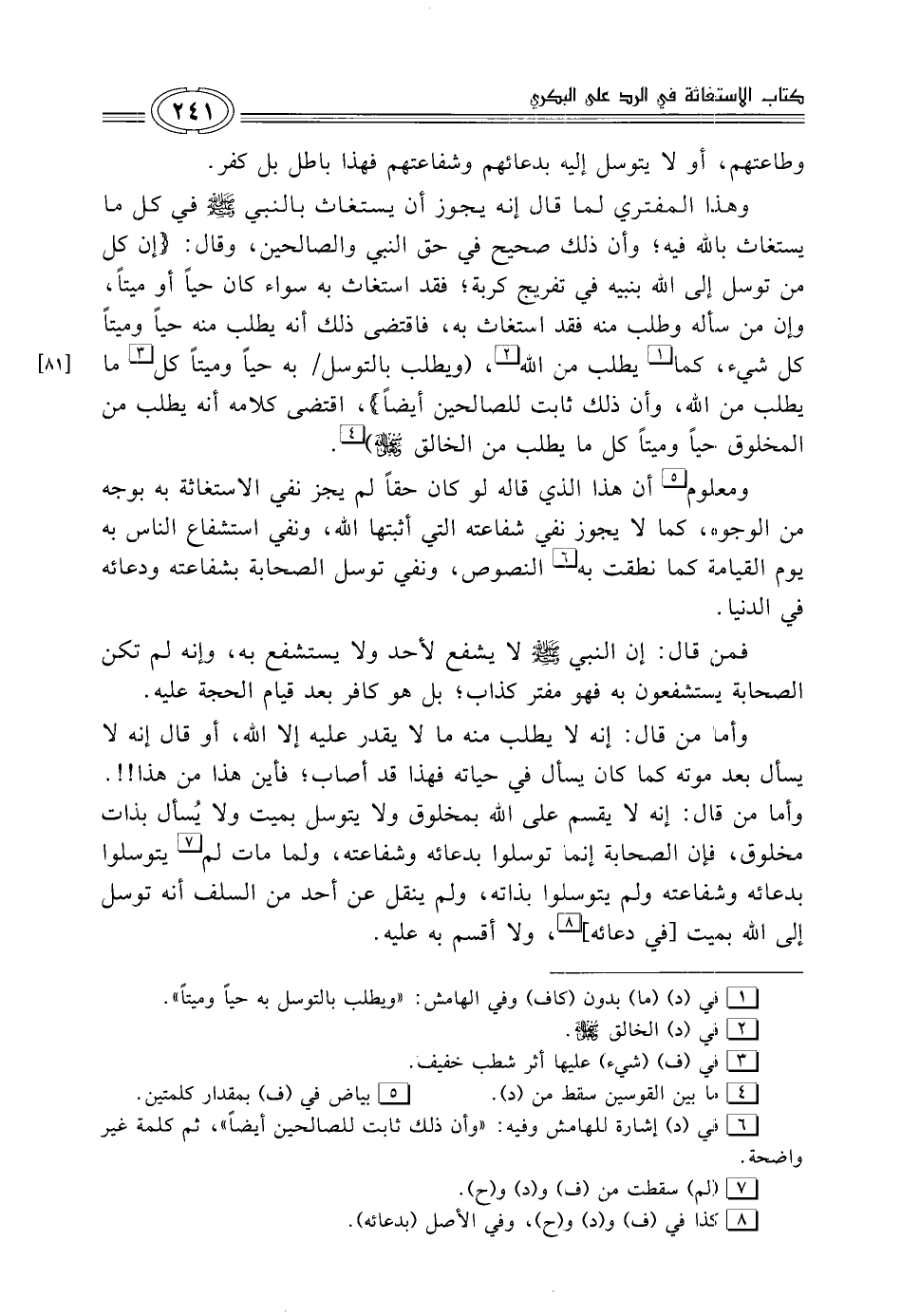 وهذا المفتري لما قال إنه يجوز أن يستغاث بالنبي - صلى الله عليه وسلم - في كل، ما يستغاث بالله فيه؛ وأن ذلك صحيح في حق النبي والصالحين، وقال: (إن كل من توسل إلى الله بنبيه في تفريج كربة؛ فقد استغاث به سواء كان حيًا أو ميتًا، وإن من سأله وطلب منه فقد استغات به، فاقتضى ذلك أنه يطلب منه حيًا وميتًا كل شيء، كما (¬1) يطلب من الله (¬2)، (ويطلب بالتوسل به حيًا وميتًا كل (¬3) ما يطلب من الله، وأن ذلك ثابت للصالحين أيضاً)، اقتضى كلامه أنه يطلب من المخلوق حيًا وميتًا كل ما يطلب من الخالق -سبحانه وتعالى-) (¬4).