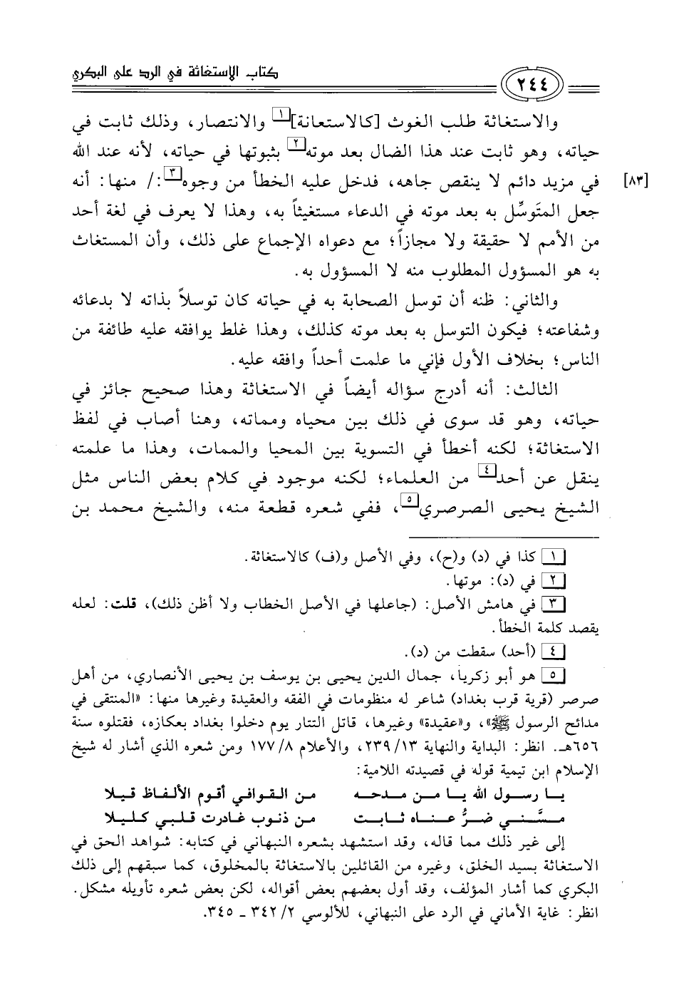 الثالث: أنه أدرج سؤاله أيضاً في الاستغاثة وهذا صحيح جائز في حياته، وهو قد سوى في ذلك بين محياه ومماته، وهنا أصاب في لفظ الاستغاثة؛ لكنه أخطأ في التسوية بين المحيا والممات، وهذا ما علمته ينقل عن أحد (¬4) من العلماء؛ لكنه موجود في كلام بعض الناس مثل الشيخ يحيى الصرصري (¬5)، ففي شعره قطعة منه، والشيخ محمد بن