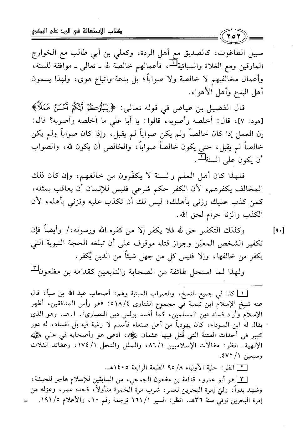 سبيل الطاغوت، كالصديق أهل الردة، وكعلي بن أبي طالب مع الخوارج المارقين ومع الغلاة والسبائية (¬1)، فأعمالهم خالصة لله -تعالى- موافقة للسنة، وأعمال مخالفيهم لا خالصة ولا صواباً؛ بل بدعة واتباع هوى، ولهذا يسمون أهل البدع وأهل الأهواء.